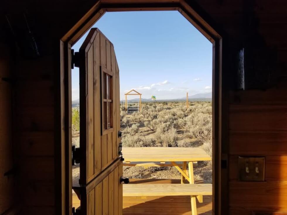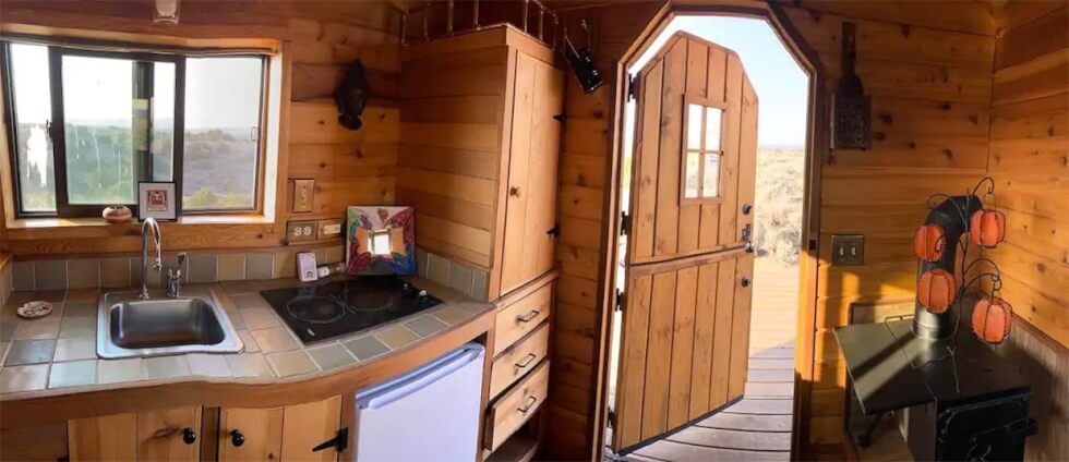 Head ten miles outside of town and you will find a cedar cabin that sits among the bushes. The tiny house hosts 100 square feet of space for two guests. It comes with a private deck that gives you wide views of the surrounding desert landscape.