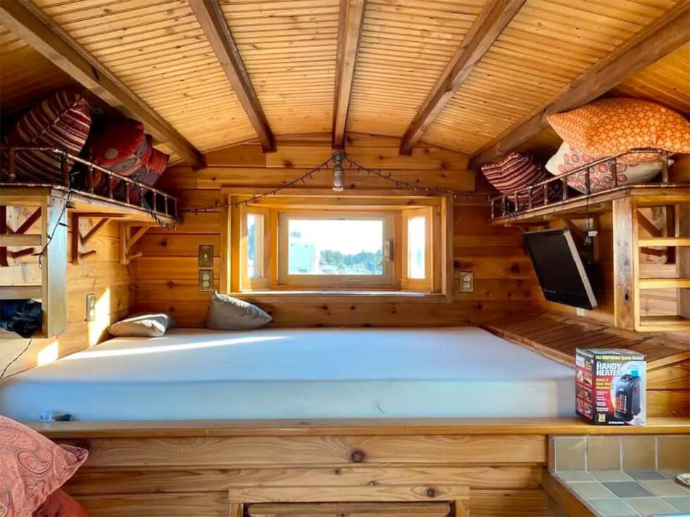The Gypsy Rose Vardo may look like your typical outdoor cabin on the outside. Inside though is a different story. The house runs on solar energy so you have the convenience and pleasure of making meals on a built-in induction cooker. There’s a mounted TV at the footbed and a DVD player with on the house DVDs. Electrical sockets allow you to power your devices and there is even a fridge, a heater that keeps the inside warm fast, a kitchen sink, and plenty of storage cabinets and pillows.