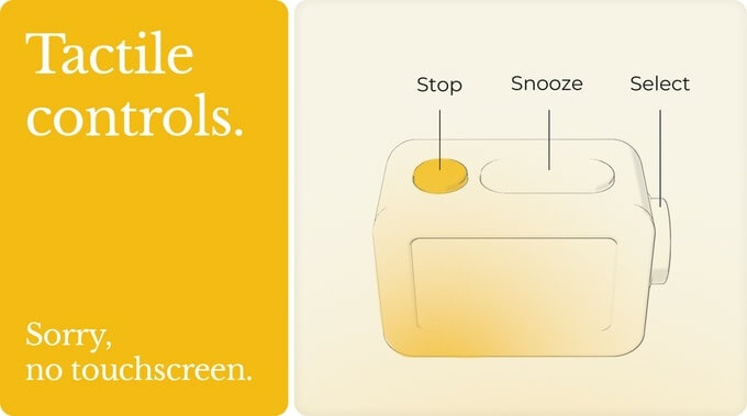 This alarm clock features a minimalist and clean silhouette devoid of modern touch controls. Instead, it uses a rotary dial to access its vast features and large, tactile Stop and Snooze buttons.