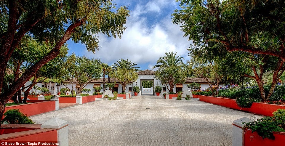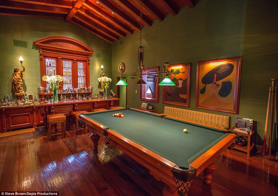 The ranch-style main building opens to an outdoor swimming pool, and the 8-acre lot also holds a red-clay tennis court designed after French Open specifications. Also above ground there is a six-car garage, a guest house, an apartment, a bocce court, a reflecting pond, and beautiful groves of olive, fruit and nut trees.