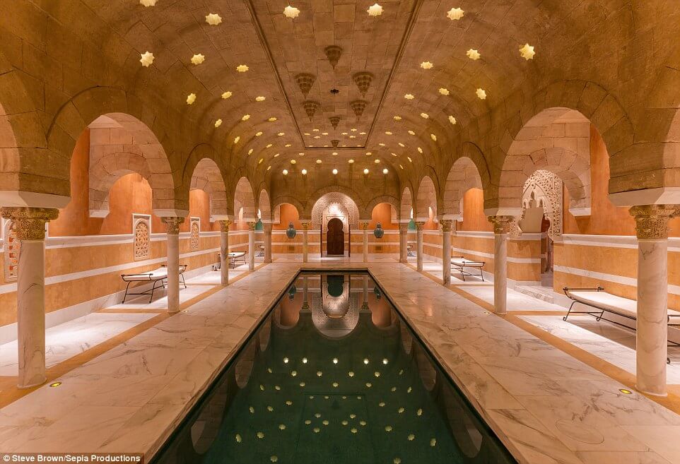 The underground part of the house holds another tennis court, this one built to US Open specifications, only this one can also be used as a massive ball room for up to 350 people, thanks to its adjacent state-of-the-art catering kitchen. There is also a stunning hammam with marble bathtubs and 24-karat gold Venetian tile, a large indoor pool, steam rooms, and professional massage rooms.