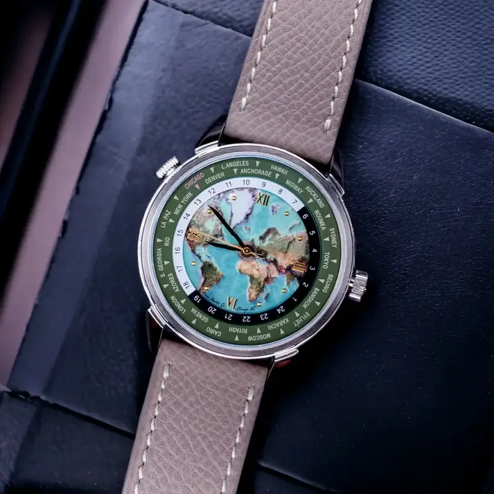 Meanwhile, to convey a cartographic motif, the hands are in the shape of a protractor. The applied hour markers are mostly dots with the execution of the Roman numeral indices for 3, 6, 8, and 12 o’clock. The Viajero will track up to 24 time zones, which the user can assign as “home” and “local” for convenience.