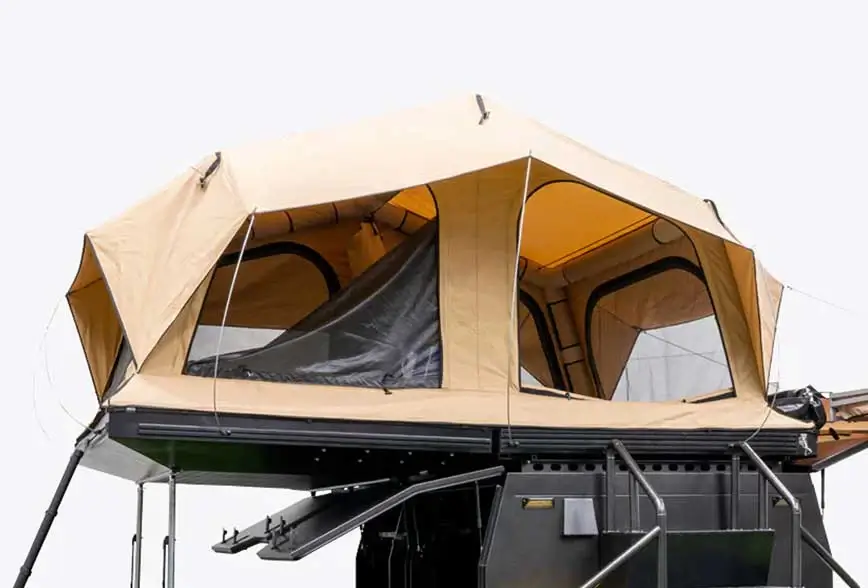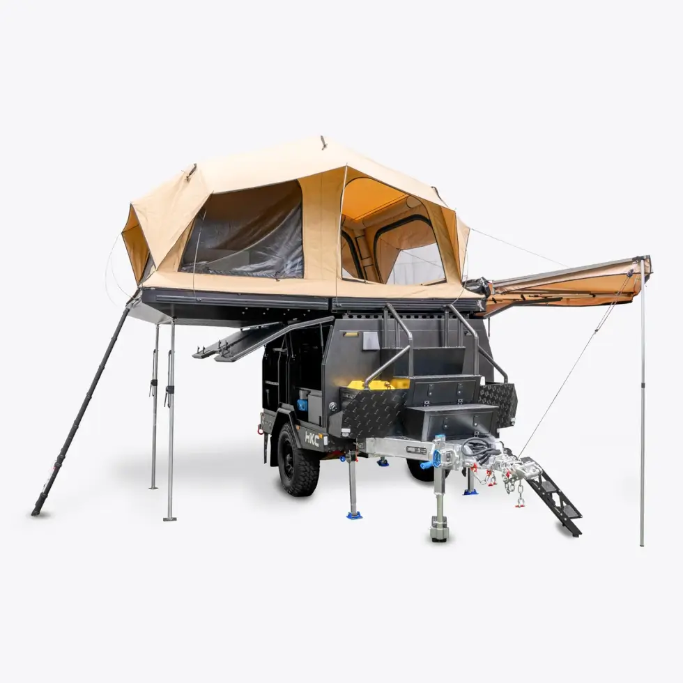 The Xplorer 2.3 Family measures 13.45′ x 6.5′ x 6.5′ (with the rooftop tent closed). It has a ramp-over angle of 59 degrees and a departure angle listed at 25.3 degrees. HKC fabricates the chassis out of hot-dip galvanized steel with an aluminum body.