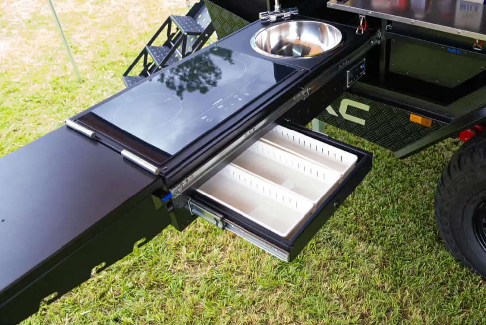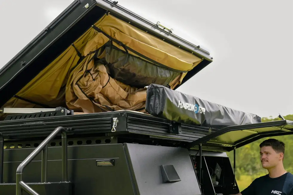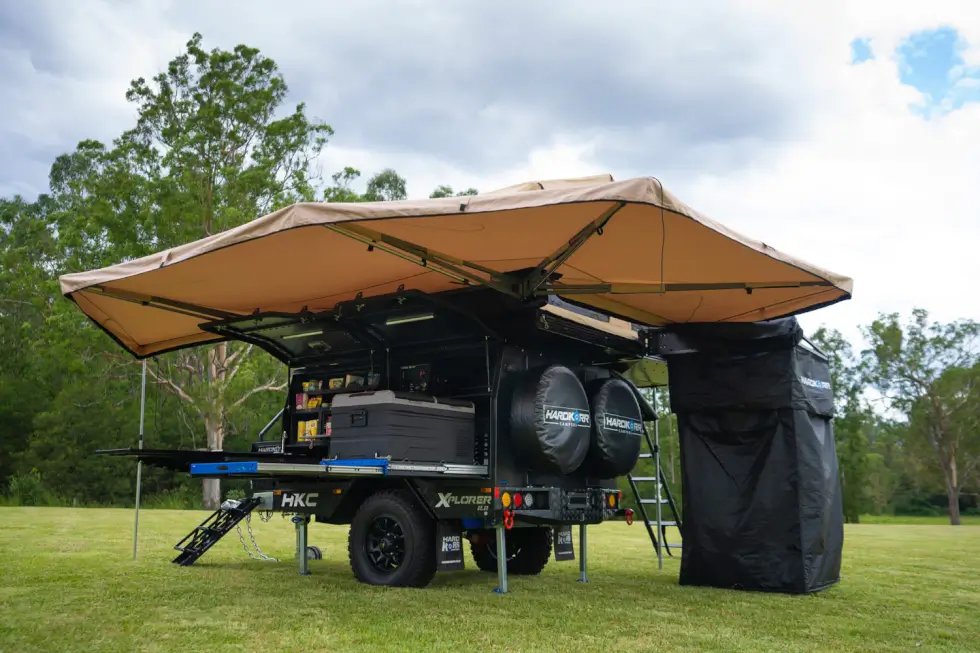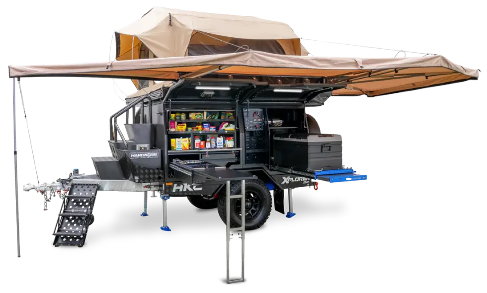 HKC also points out the modular characteristics of its Xplorer 2.3 Family. This model includes a HARDKORR 270-degree free-standing awning, 12V water pump, 2x 20-liter jerry can storage, Fridge slide with prep bench, a customizable pantry, induction cooktop, and 2x 135 Ah lithium batteries among others.