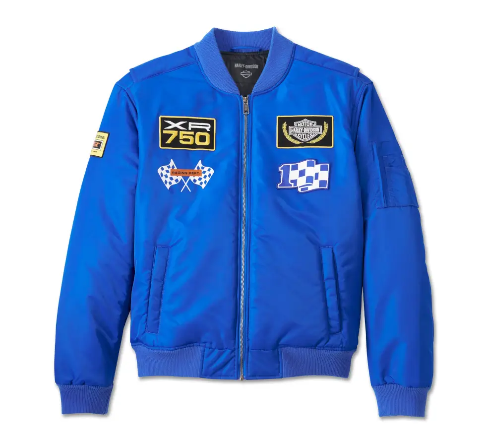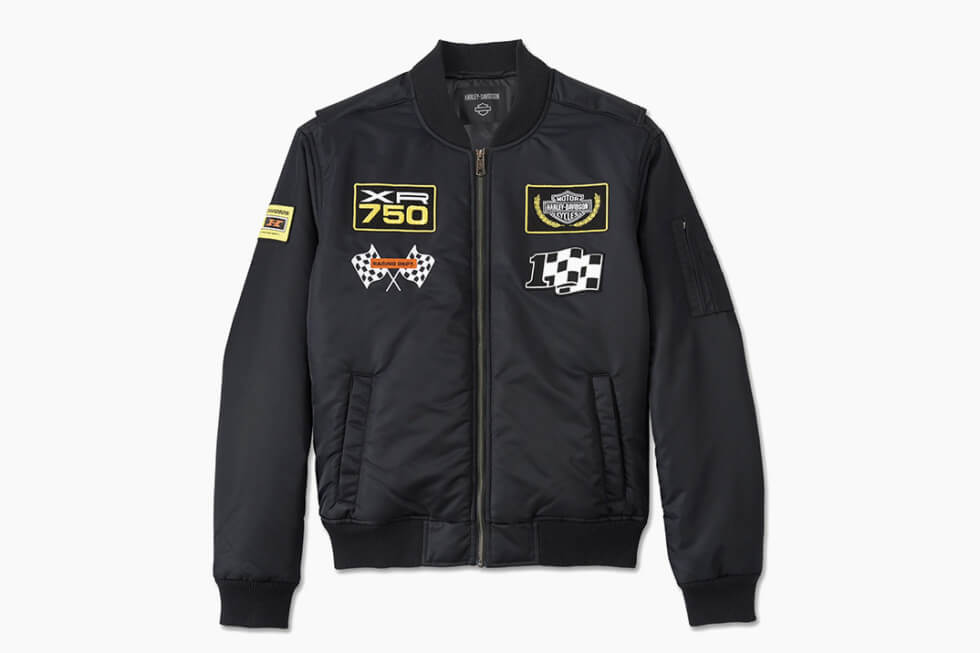 “At The Crank Bomber Jacket” also features Harley-Davidson’s retro logo on the back, a classic Bar & Shield logo patch on the front, and an H-D Race Department logo patch. It also has a replica patch based on the #1 front number board that the XR750 used throughout much of its golden era of competition.