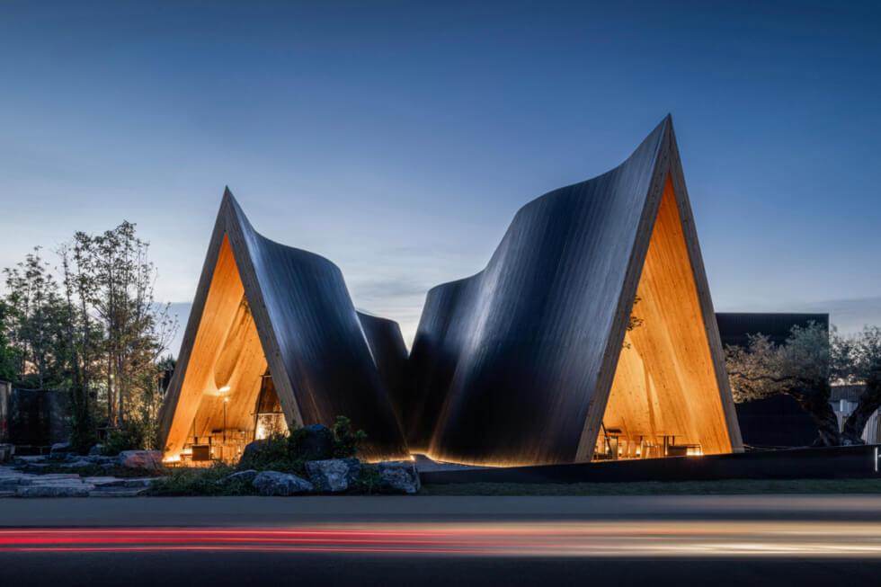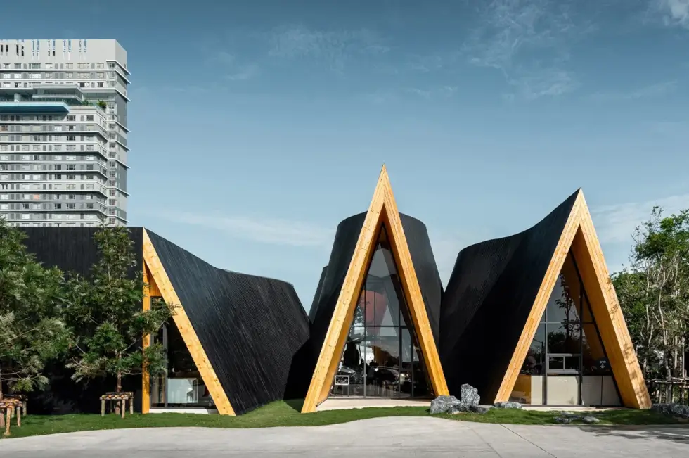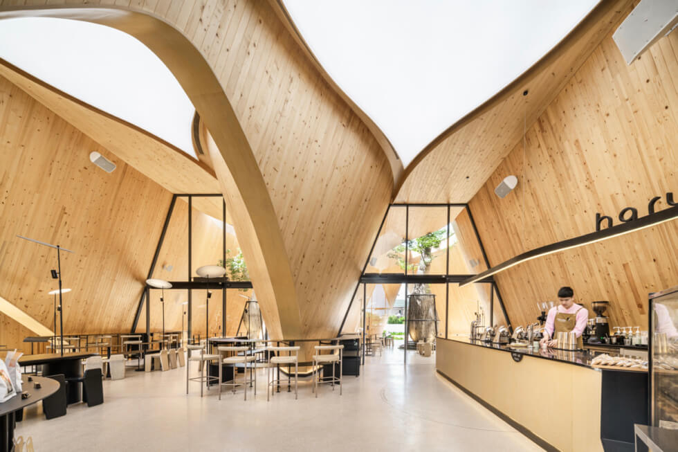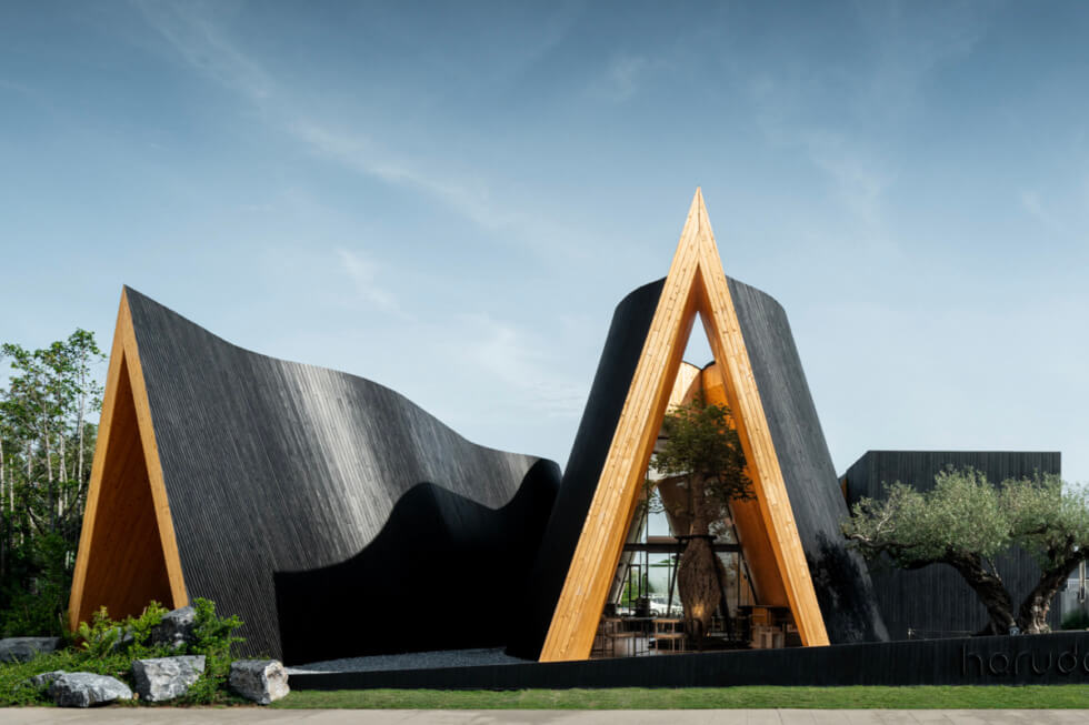 Local studio IDIN Architects designed HARUDOT CHONBURI in three interconnected gables clad in vertical blackened timber planks. Located in the beachside town of Chonburi, Thailand, the unique-looking curved structure was designed for both the cafe brand Nana Coffee Roasters and the landlord who runs a business selling exotic plants.