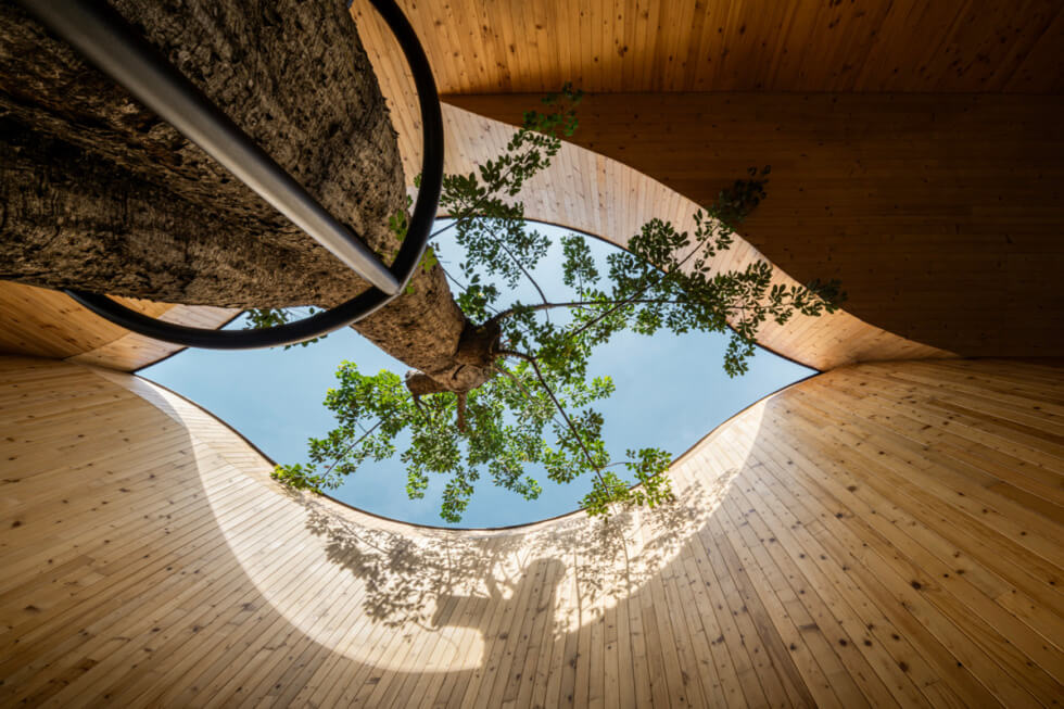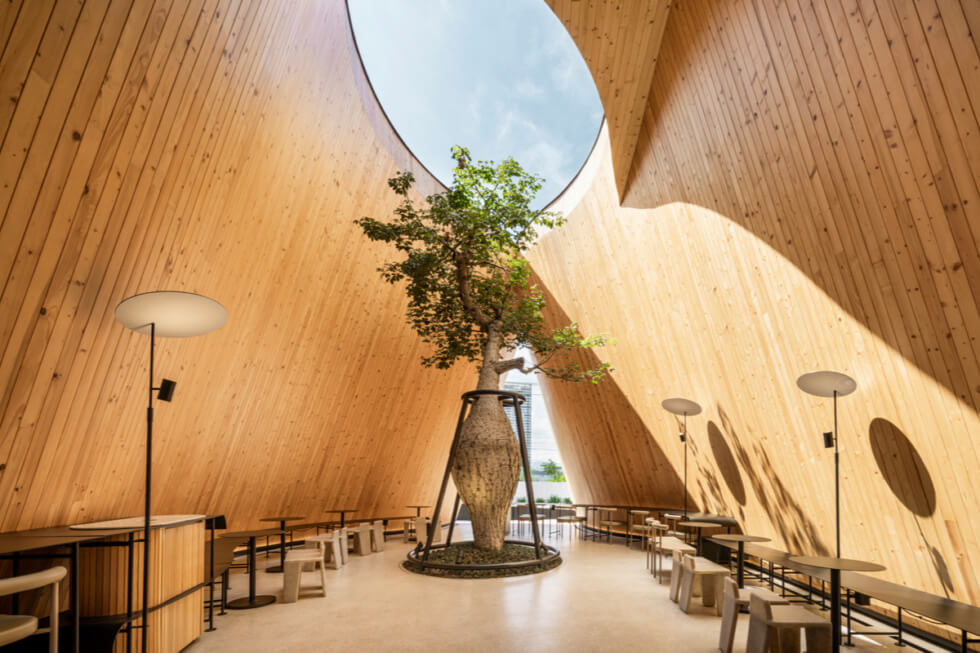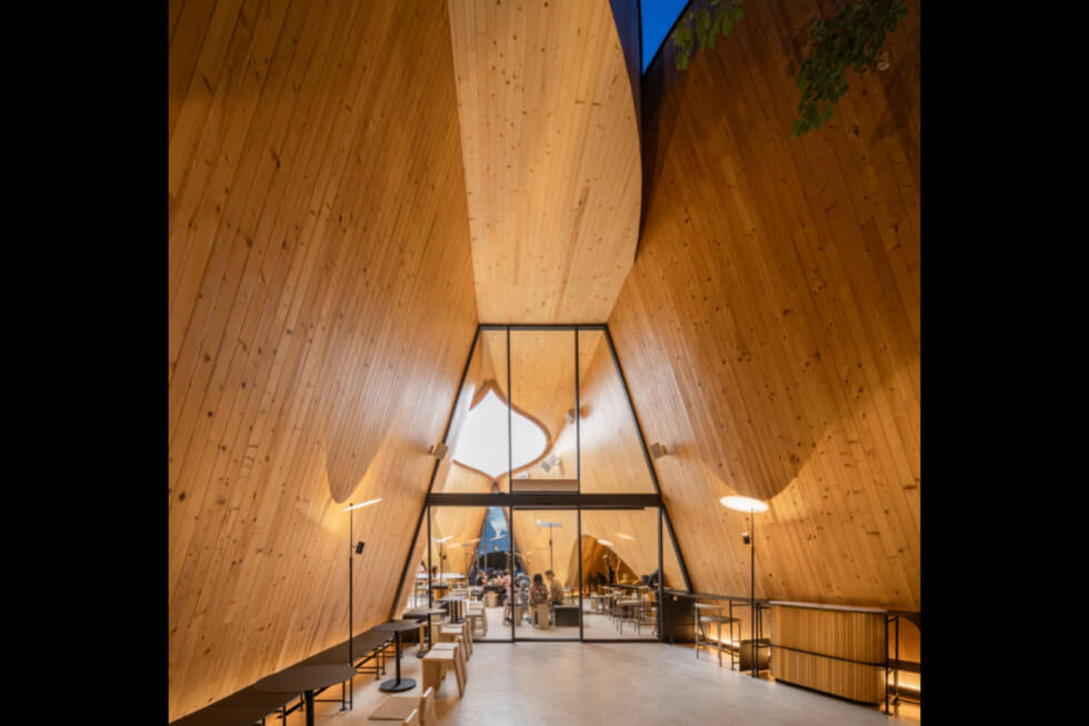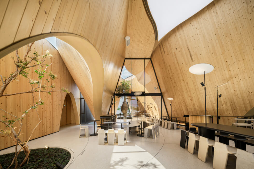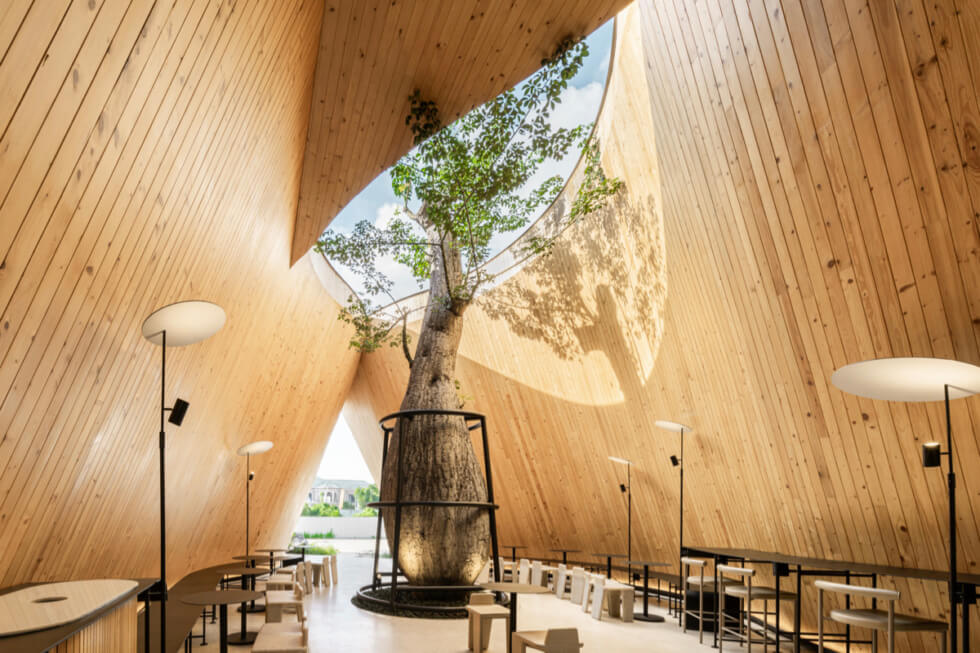 HARUDOT CHONBURI is “separated into smaller masses to control the scale of the gable form, which created different zones such as the bar, coffee drinking zone, a lounge, a meeting room, and the restrooms. The form of the building which resembles giant gable roofs are pulled apart at certain parts, allowing the tree to penetrate through a void to the sky while creating a semi-outdoor space underneath,” IDIN Architects said.