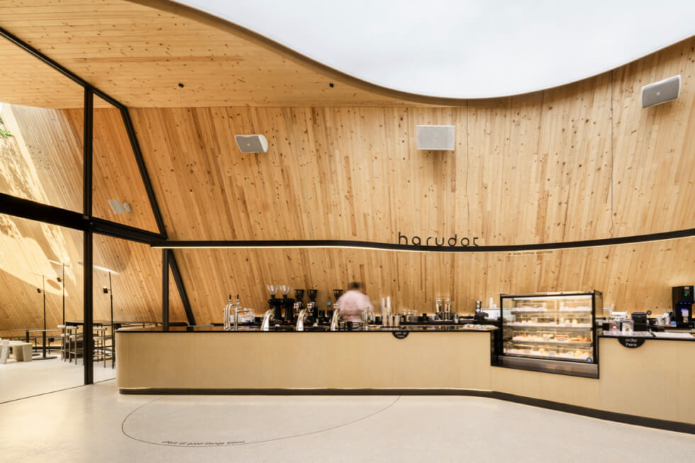 These voids resulted in a curve form that adds movement to the architecture. Meanwhile, the black exterior provides a contrast with the interior walls, which are clad in natural-colored pine for a cozy atmosphere. As for the seating, the team designed it to be continuous, like a ribbon wrapping around the interior spaces whereas the height of the counters differ to suit different functions and uses. The entire design of HARUDOT CHONBURI is inspired by Japanese design, which IDIN Architects describes as “humble simplicity with attention to details.”