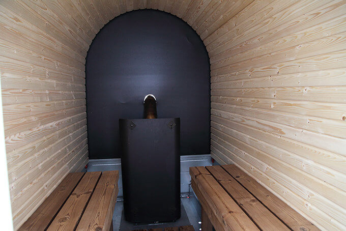The Harvia ATV Sauna is constructed from Ultratec and its frame and shaft have extra reinforcement to maintain safety measures. Meanwhile, XPS thermal insulation boards found between the inner wood paneling and steel panel exterior provides insulation. Since this is an outdoor sauna, a shaft support leg ensures it securely stays in place even when placed on uneven terrain. The addition of strong four-ply low-pressure off-road tires keeps it balanced and standing even when towed over rocky plains.