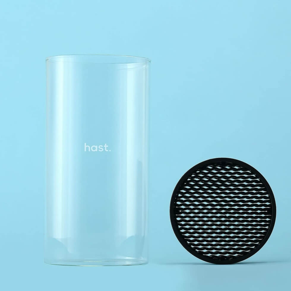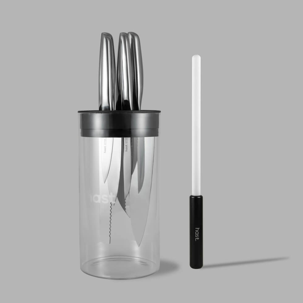 The Hast 7P Minimalist Knife Set even comes with a ceramic or aluminum honing rod to keep the edges sharp. All these come together in a clear tempered glass knife block for an elegant aesthetic appeal.