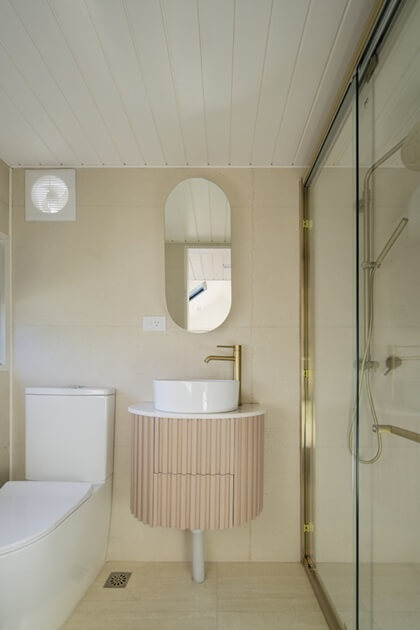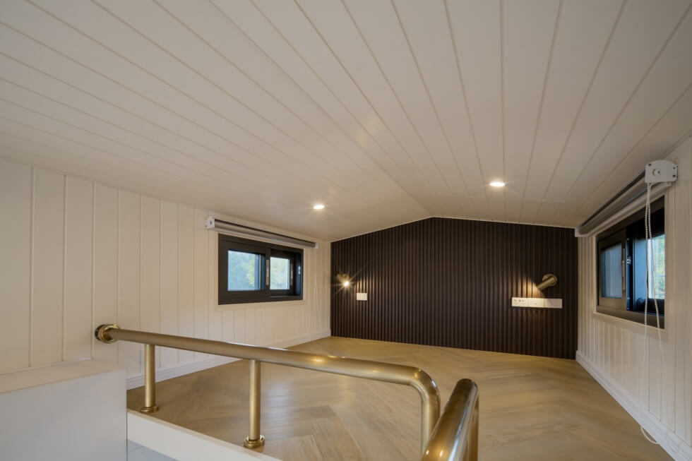 Meanwhile, the kitchen boasts a premium stone benchtop, two-burner gas cooktop, electric oven, dishwasher, and provisions for other appliances. Havenn Tiny Houses also supplies optional add-ons to fully kit out your Clair 8.5L.
