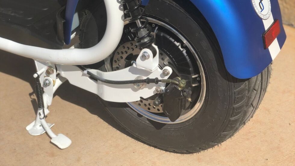 This vehicle has a ground clearance of 5.75 inches, comes with a premium seat with extra padding for a comfortable ride, and a welded 1-piece handlebar assembly for a safe ride. The electronics are neatly hidden to prevent wear and tear and a spring-loaded kickstand means less effort needed to park the scooter.