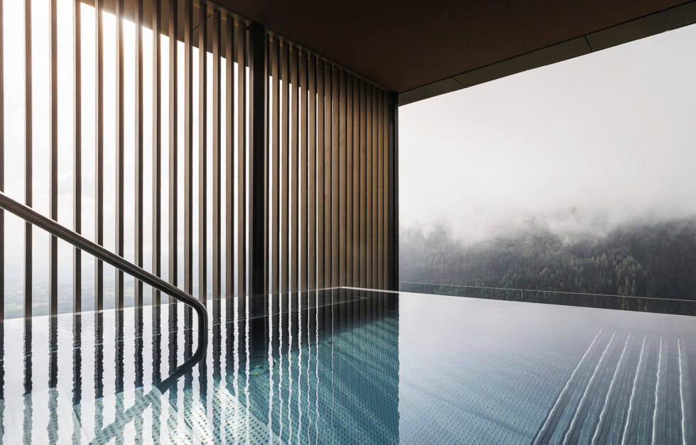 The structure appears to be floating about 50 feet off the ground until you notice the walkway. NOA – just like their work on the Hotel Hubertus’ pool — cantilevers the steel platform to extend outward from a building on its grounds. This is definitely not for folks with a fear of heights.