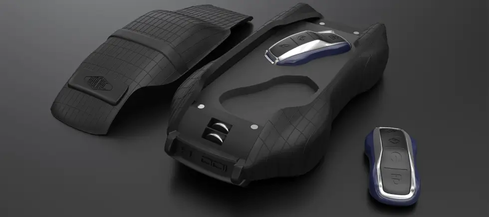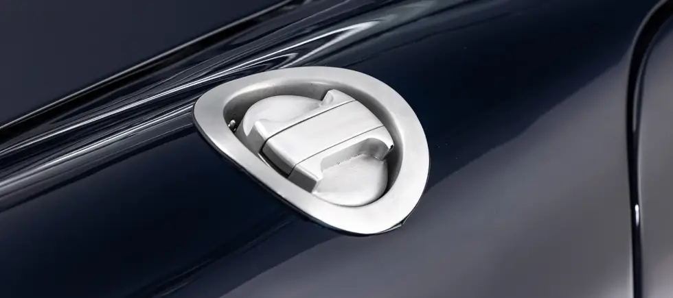 To highlight this 911’s most iconic feature, the Targa arch receives a makeover. An aluminum plate with the Hedonic Machines emblem at the foot on each side now comes with a braided mesh insert. This median band on the [H]000 resembles a vent grille on the engine cover.
