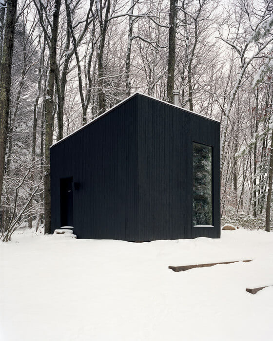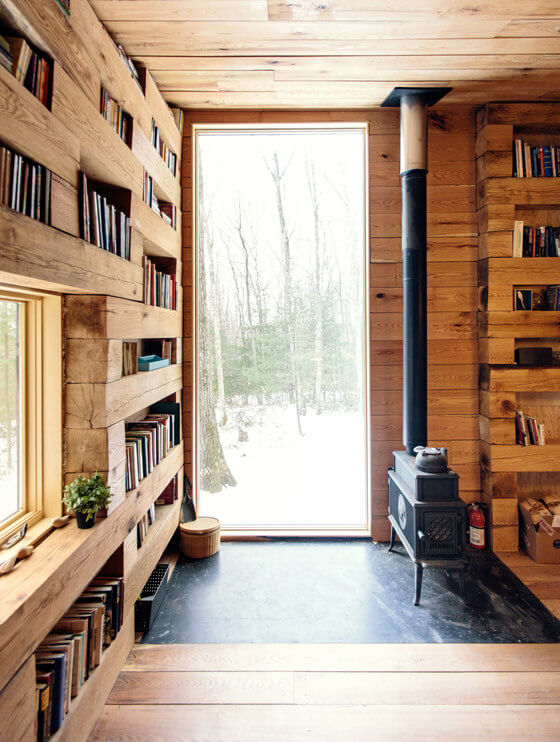 The owner of the cabin (of Norwegian heritage) had a vacation home constructed in Upstate New York and wanted a separate single-room library on the property. Thus the birth of the Hemmelig Room, which in Norwegian translates to “secret room.” From the outside, it looks nothing more than a single volume of blackened timber carved with a single long window and door. By the doorway is a wall light that illuminates the entrance.