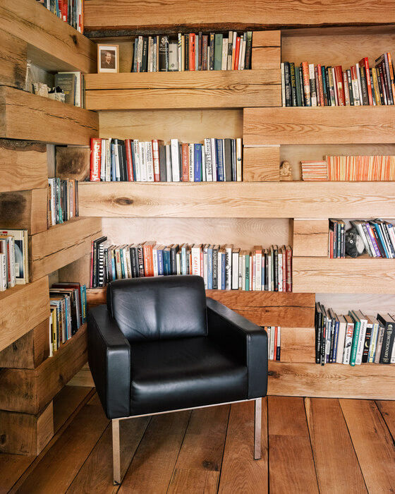 The oak tree’s raw, polished form encompasses the interior in nonuniform timber panels then merged to create the crevices to hold the books. To complete the relaxing ambiance, there is a wood-burning stove to keep the place warm and a sitting area where readers can comfortably lounge with a book.