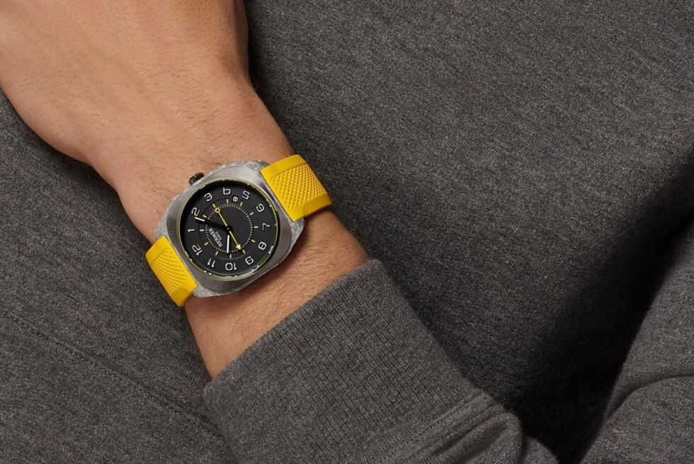 Meanwhile, the case back is outfitted with a tinted sapphire crystal. It provides a glimpse of the in-house H1837 self-winding caliber’s rotor and inner workings. The movement boasts a 50-hour power reserve. The H08’s rubber strap is available in four shades: blue, green, yellow, and orange. Moreover, it matches the indices of the dial and seconds hand.