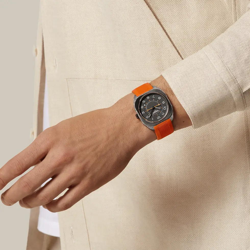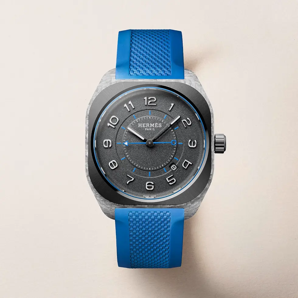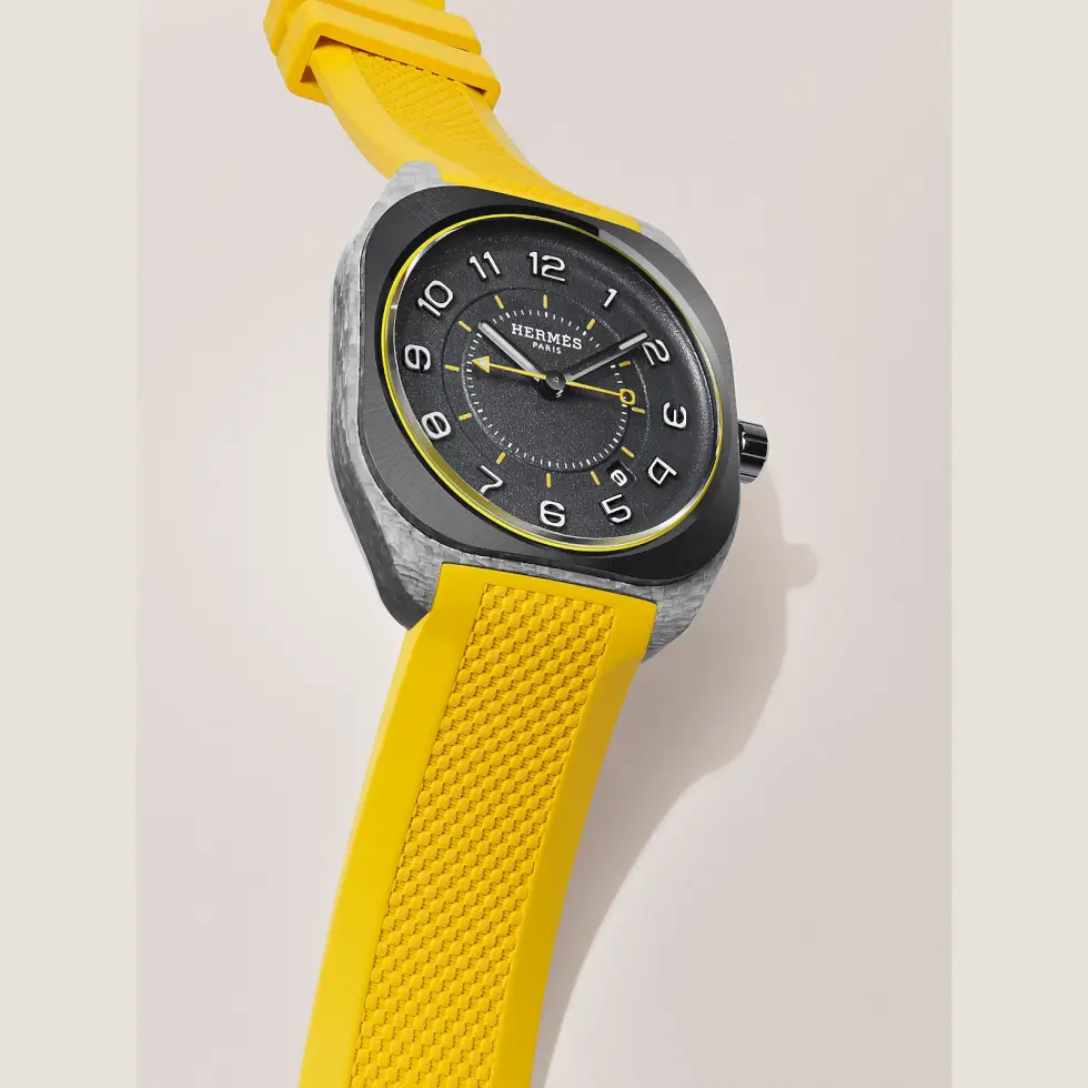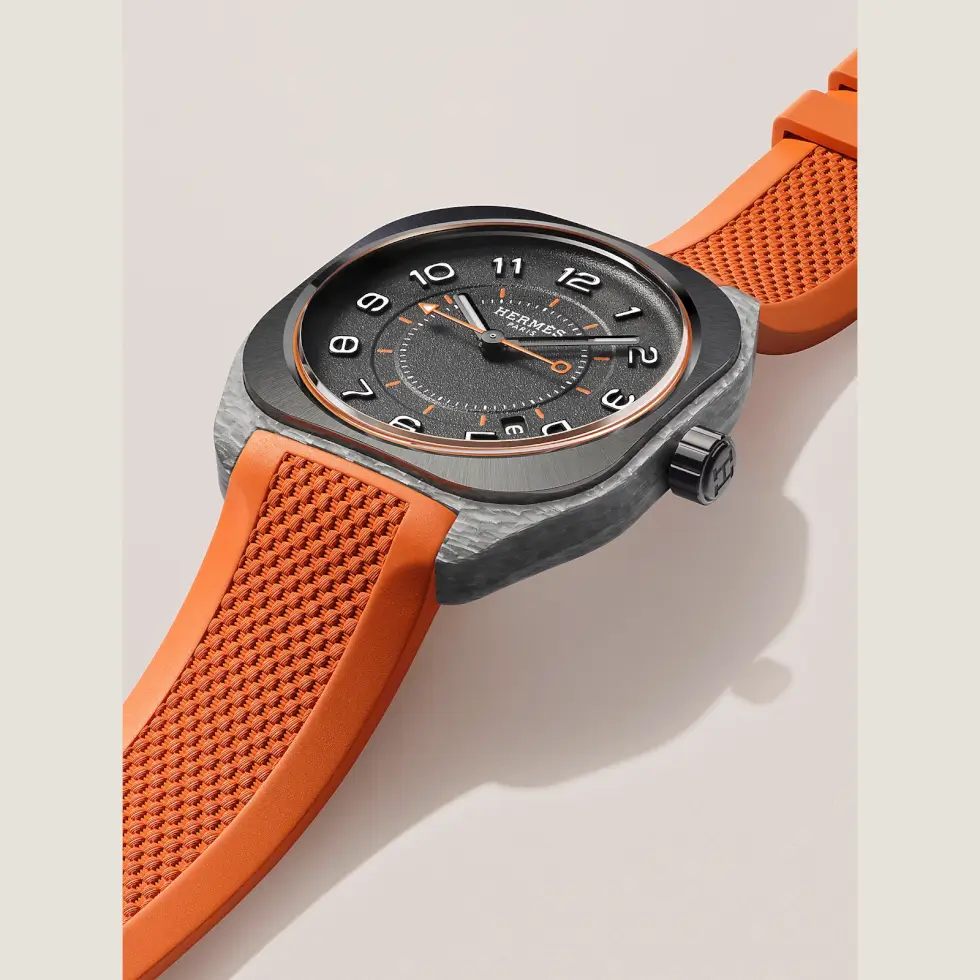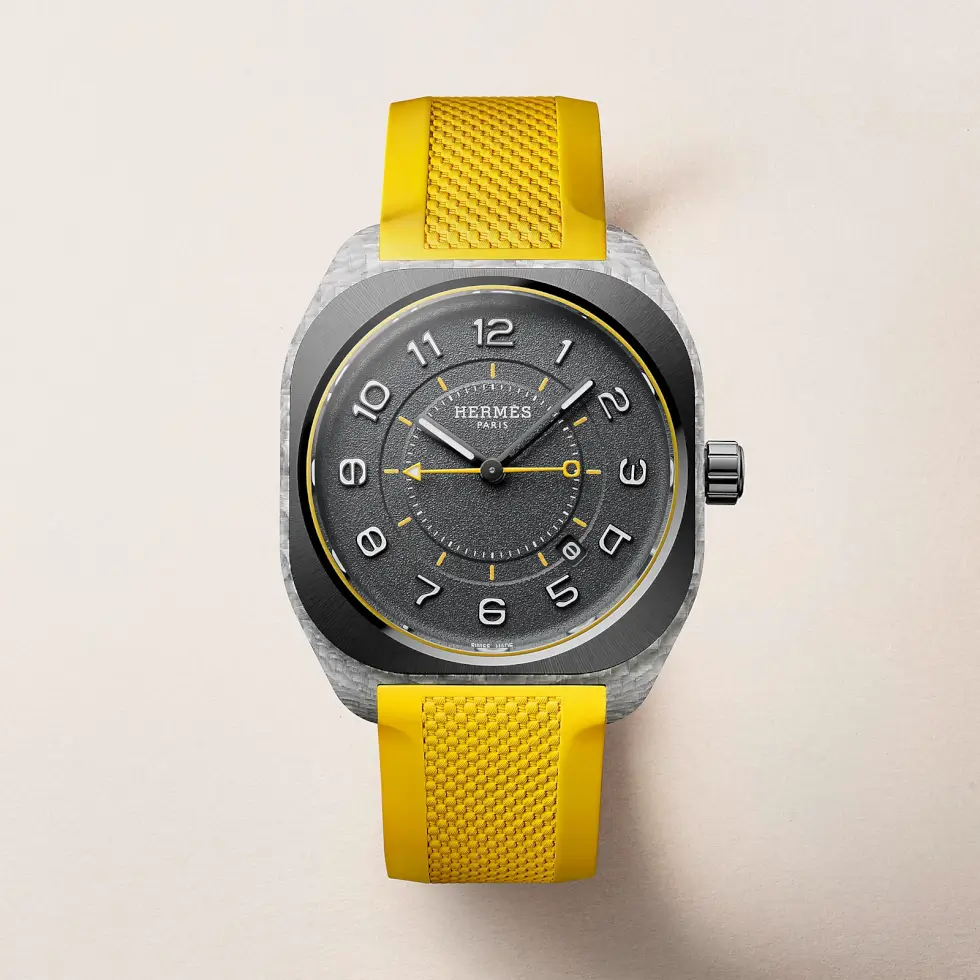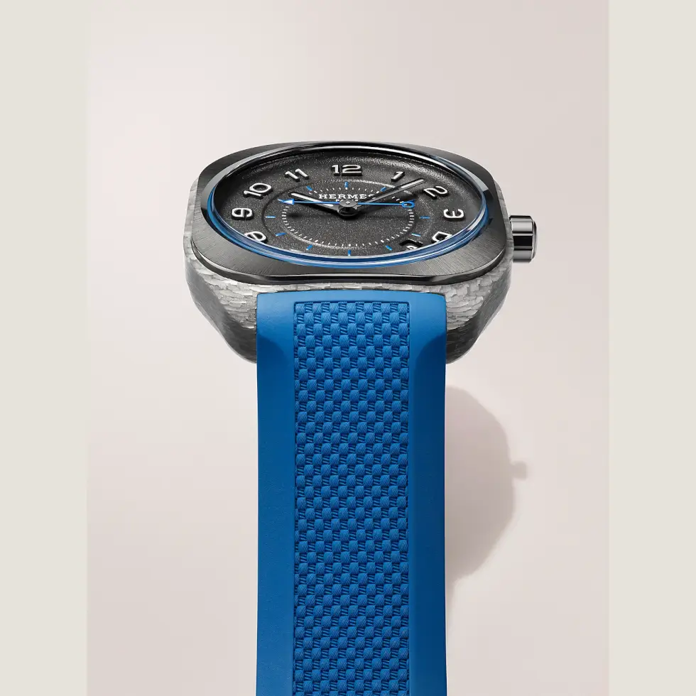 The overall outline of the case is a square with rounded corners, which is presented in black ceramic with a striking satin-brushed finish and polished chamfered edges. It’s framing a round dark concrete dial flaunting grained texture. Hermès decision to blend varying textures results in a bold yet understated elegance you can easily match with casual or formal outfits.