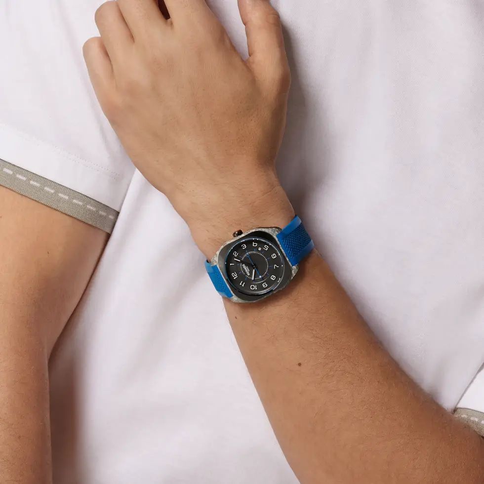 If the extra sub-dials appear too busy for your minimalist tastes, this iteration of the H08 touts a cleaner aesthetic and a new type of case. According to the product details, its 42 mm x 39 mm case is fabricated out of braided glass fiber composite with an aluminum and slate powder treatment. This process endows the housing with a captivating metallic silver tone.