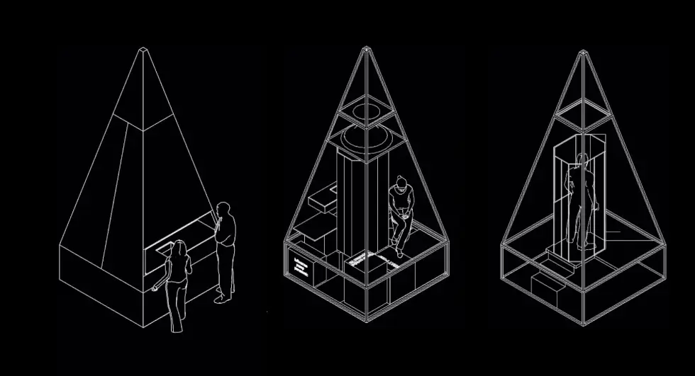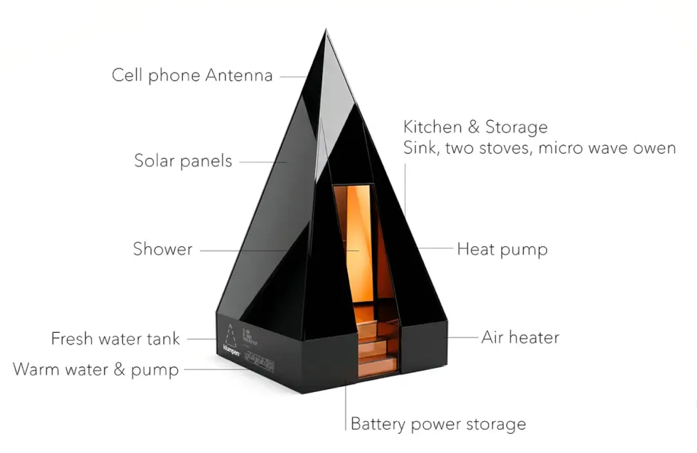 From the outside, it appears to be nothing more than a compact teepee-like structure. It spans only 7 square meters and stands 15 feet (4,850 mm to be precise) tall. Yet, it holds the essentials for off-grid living, including water, power, drainage, cables, and more.