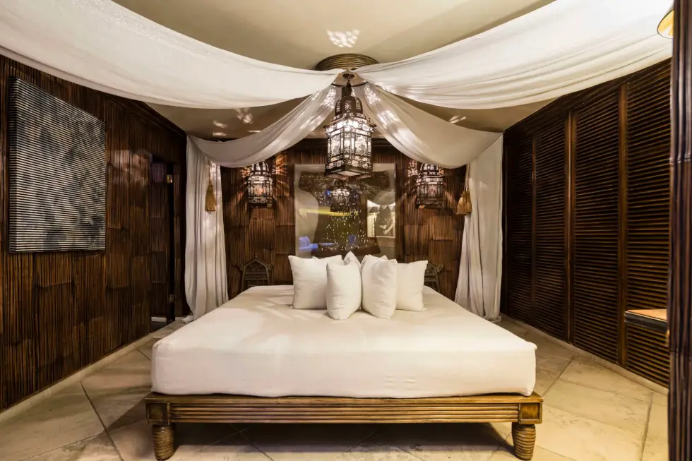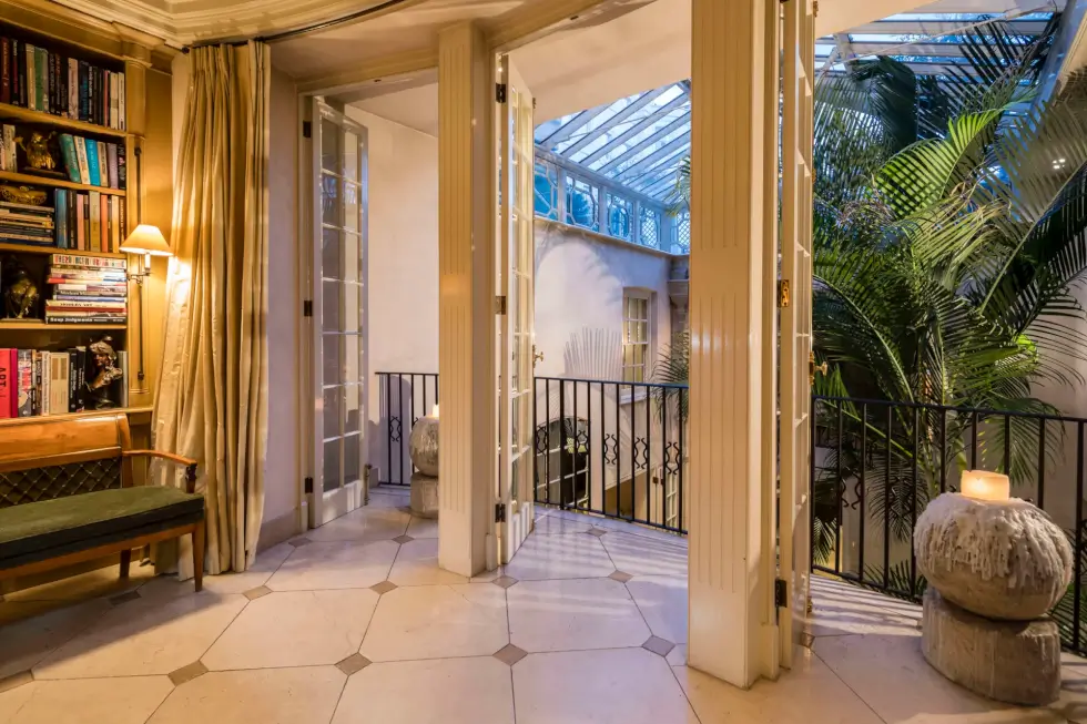 Designed by renowned architect Detmar Blow, the 8,500-square-foot property features stately red-brick cladding with stone dressing and neo-classical cornices. The facade boasts a stunning double-fronted design with five wide windows. The house hosts six bedrooms including an opulent primary suite that occupies the entire second floor. It is equipped with a projector over the bed, a private terrace, a large walk-in closet, and an en-suite bath.