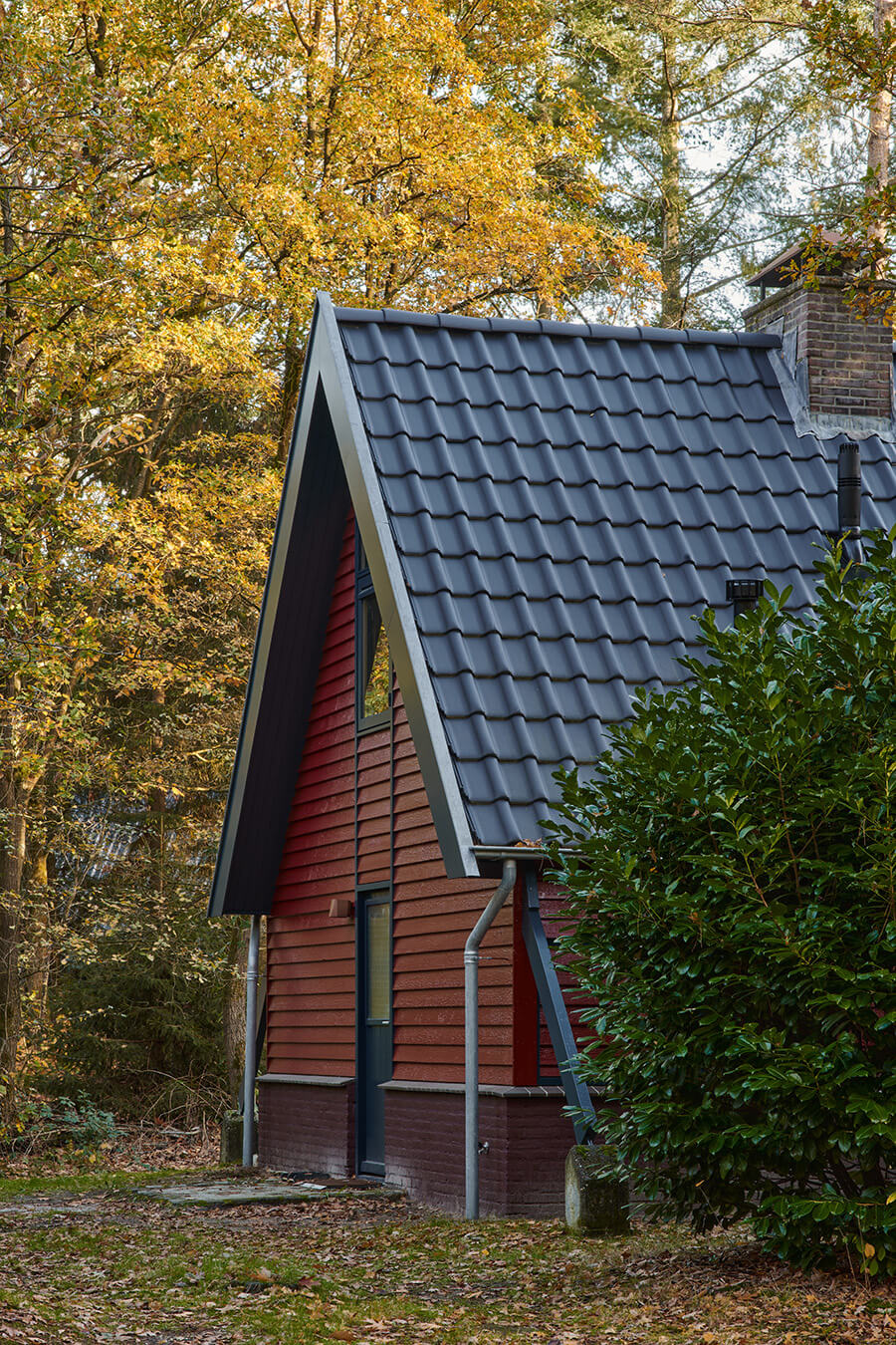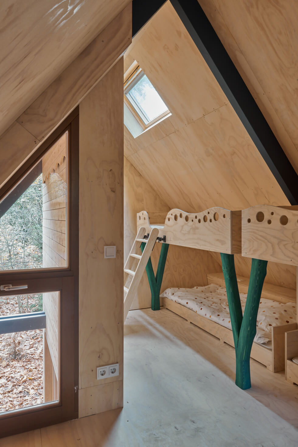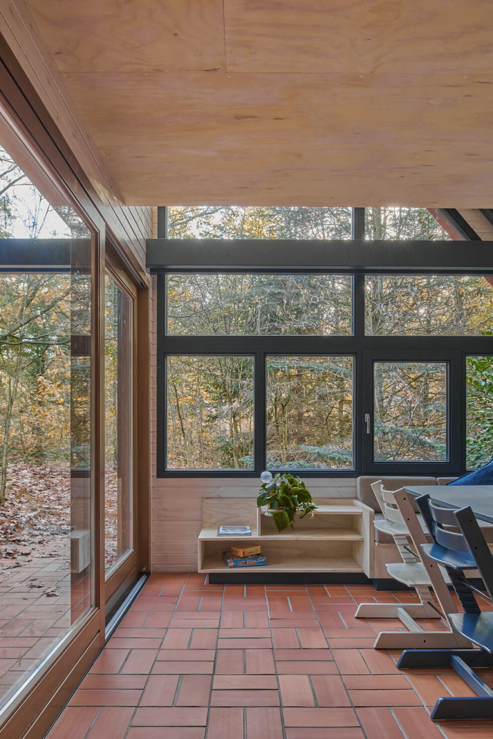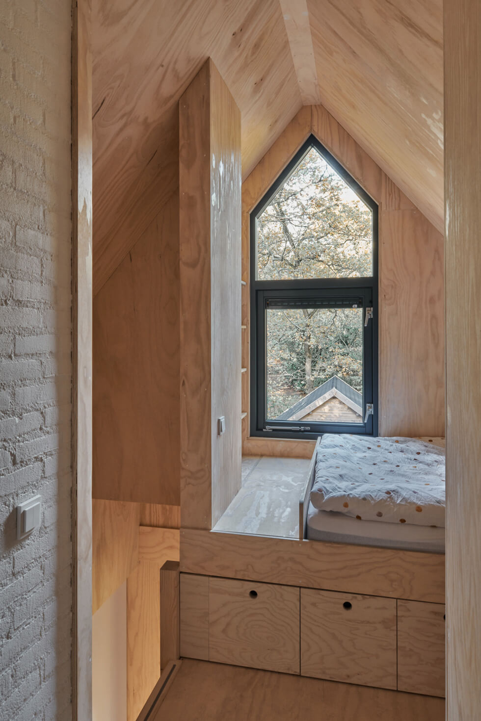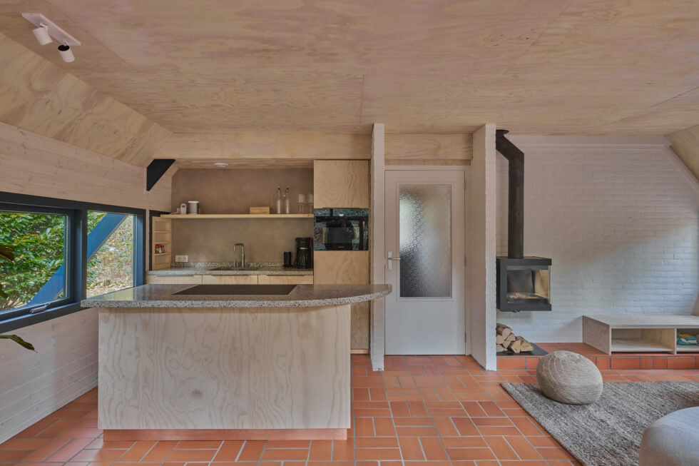 Recently completed just this year, the Holiday House Herperduin is in Herpen, Netherlands. The property spans roughly 915 square feet and stands on a small clearing. The location is a “forest park near the Herperduin nature reserve, surrounded by heathlands, ponds, and sand drifts,” writes the studio.