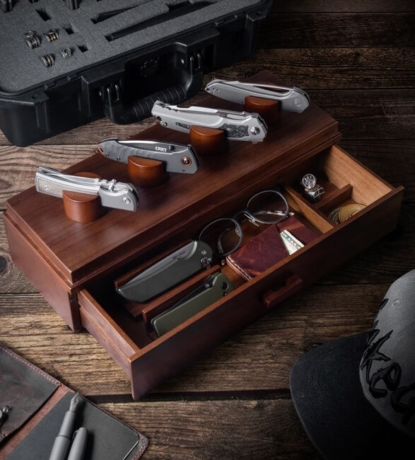 This is an elegantly crafted valet designed to specifically display and organize your prized collection of knives and accessories. It can hold up to six knives and offers four external knife holders. Each holder features functionally shaped grooves to securely hold them in place. Meanwhile, the Knife Deck drawer has two internal holders with a sloped base that keeps the knives in place during opening and closing.