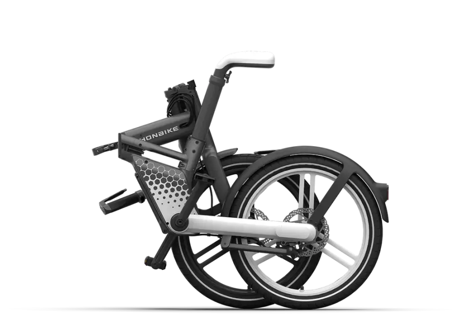Honbike lists the total length as 60.8” with a height of 41.7” measured from the ground to the top of the handlebars. When folded, the dimensions shrink to 39” x 17.9” x 33.1” (L x W x H). The HF01 ditches the traditional bike chain or belt in favor of a patented shaft drive setup. All parts are protected from the elements via an aluminum shell.
