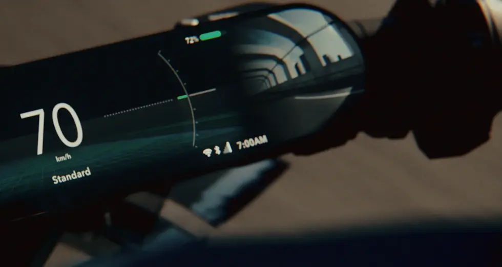 It’s easy to miss, but another cool design element of the EV Outlier Concept is the seamless integration of digital rear-view displays to the periphery of the primary instrument cluster. Look below, and another digital panel sits where the fuel tank usually is. The subsidiary screen changes depending on the riding mode.