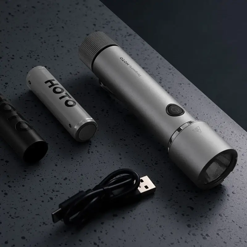 The Hoto Flashlight Tactics 2300 comes with a 3100mAh USB-C rechargeable battery and a couple of CR123A backups. All these amazing features come in a pocket-friendly design clocks in at just 5.91″ long and 1.34″ thick. This flashlight quickly brightens your surroundings in seconds while maintaining a sleek silhouette.