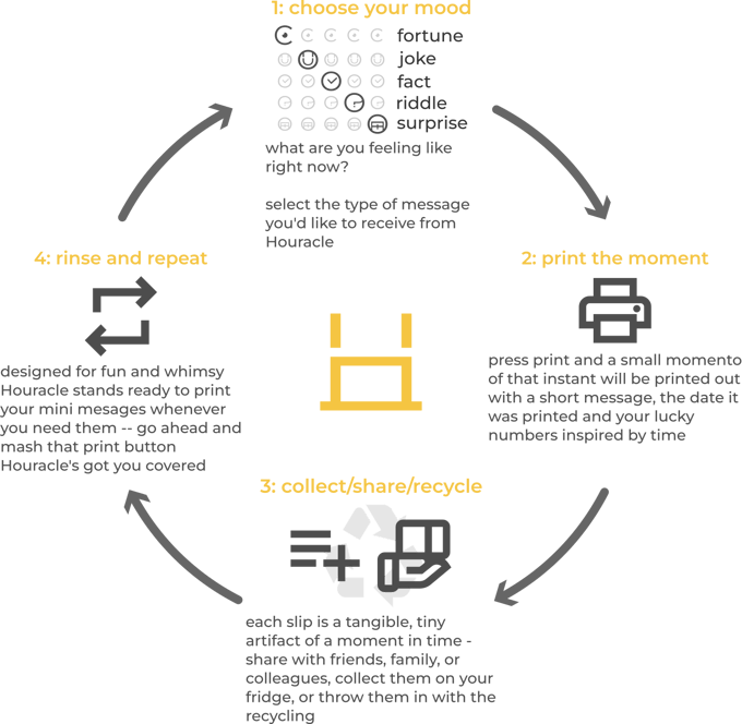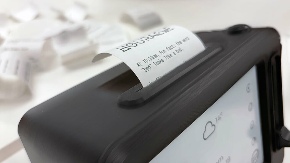 Meanwhile, right along the right edge are five icons that lets you select mode, fortune, fact, joke, riddle, or surprise via a yellow sliding button.Then at the top of the Houracle’s frame is an eco-friendly thermal printer that spits out corresponding answers to your chosen icon.