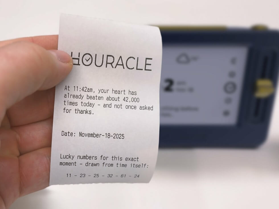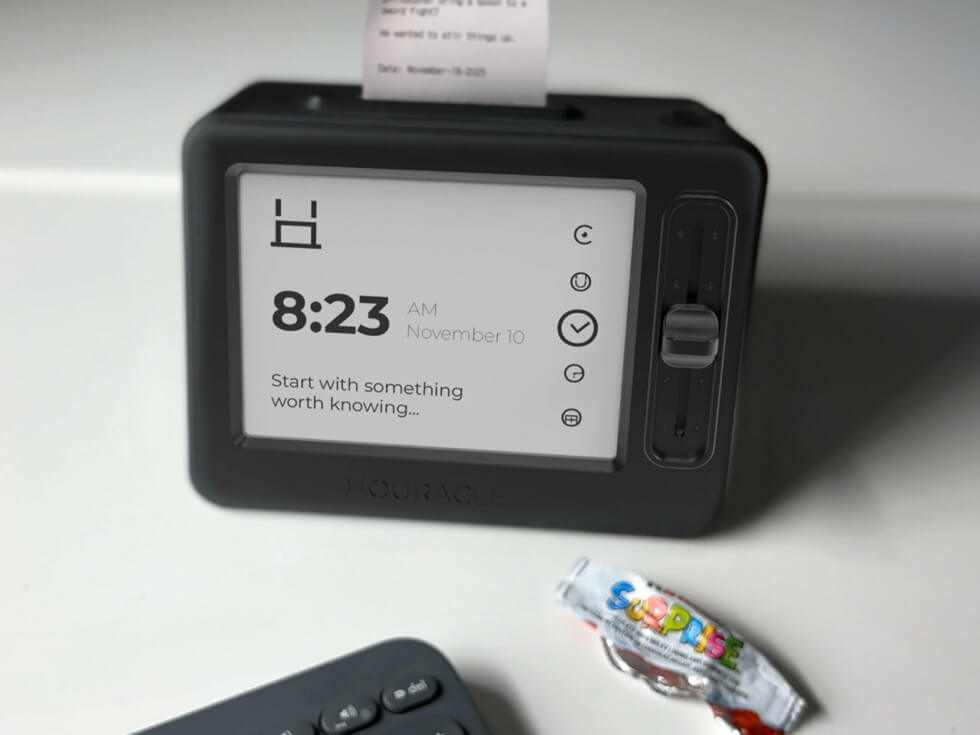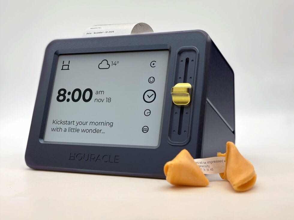 As its name entails, it’s part clock and part oracle that features a retro, boxy design in a powder-coated aluminum shell with rounded edges. It has a 5.6-inch e-ink screen that displays the time, date, the weather of your selected location, and a small prompt that invites you to print.