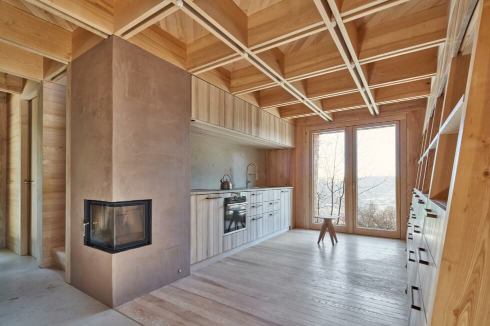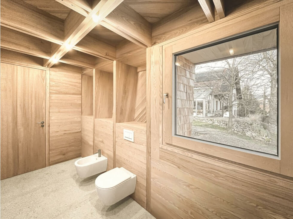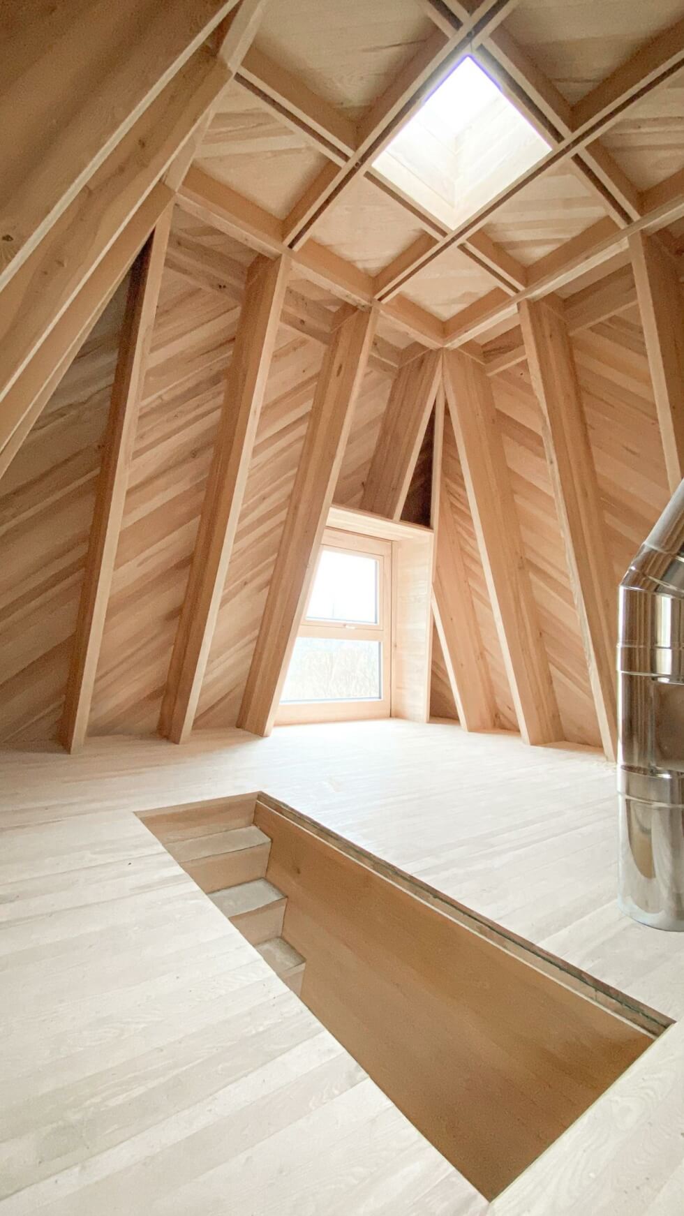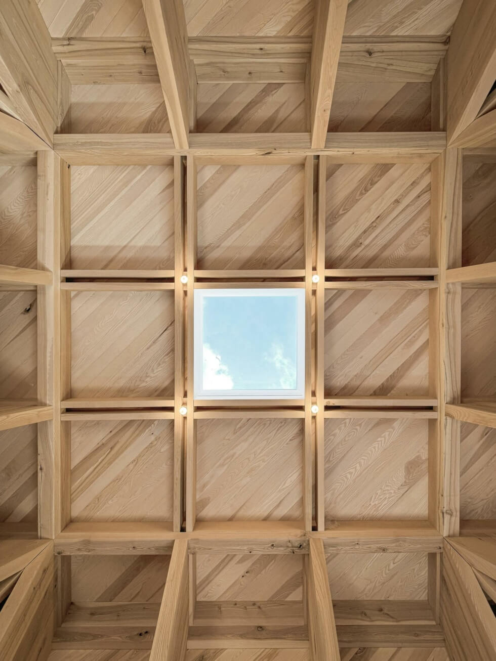 Meanwhile, dovetail joints ensure the structural integrity of House Anton II. The beams of the coffered ceiling rest on them at a tilted 7-degree angle outward, creating eaves. These eaves prevent water from splashing onto the wooden base and offer shading to the ground-floor windows from the summer heat.