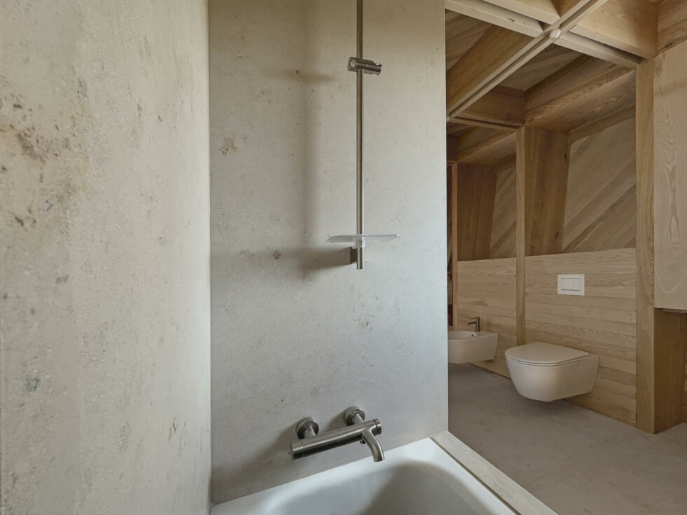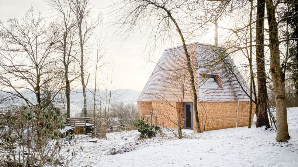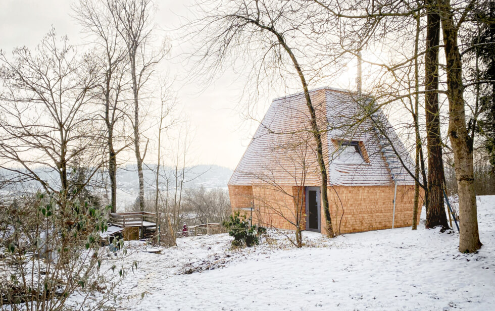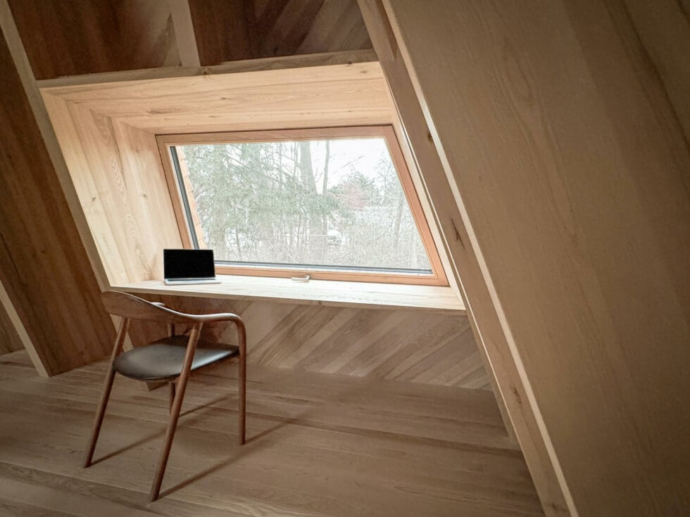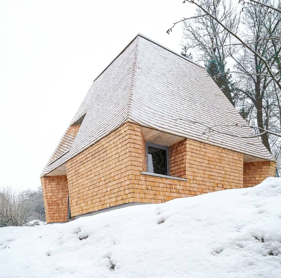 Meanwhile, dovetail joints ensure the structural integrity of House Anton II. The beams of the coffered ceiling rest on them at a tilted 7-degree angle outward, creating eaves. These eaves prevent water from splashing onto the wooden base and offer shading to the ground-floor windows from the summer heat.