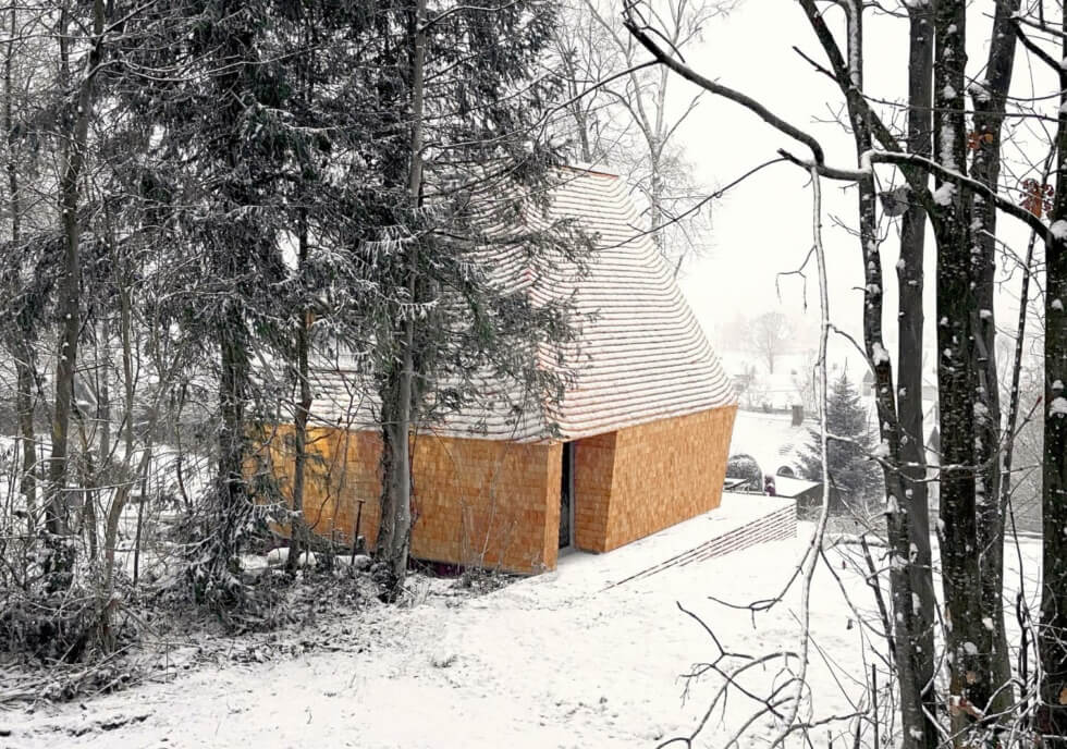 Located near Augsburg, Germany, overlooking views of Schmutter Valley, is House Anton II, an 80-square-meter collapsible two-story house constructed without glued elements. Instead, milled CNC (Computer Numerical Control) and mechanical joints fastened wood pieces together to adhere to circular-economy principles.