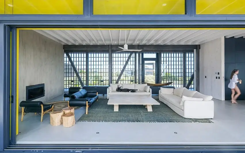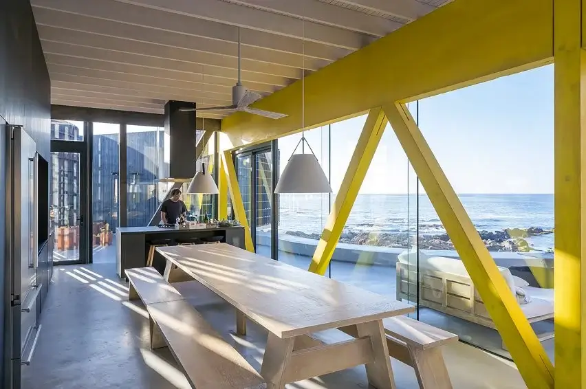 The living room, kitchen, and dining area are in the main pavilion. “The central pavilion and the main bedroom rise above the sea as if on a ship,” the studio said. This space features a large yellow-stained laminated wood beam that is 26 meters long, 80 cm high, and 18 cm thick. The sliding glass doors open the space further and the roof extends past its perimeter to form a shaded porch.