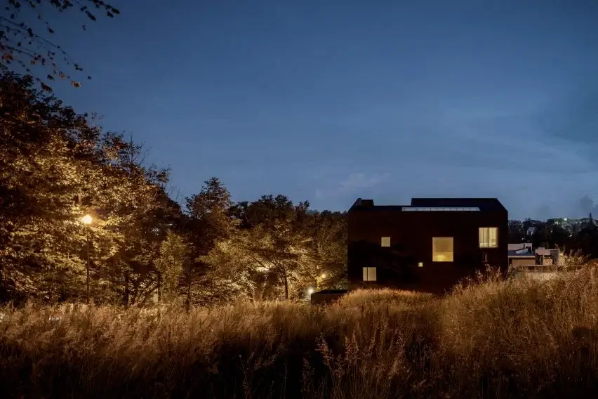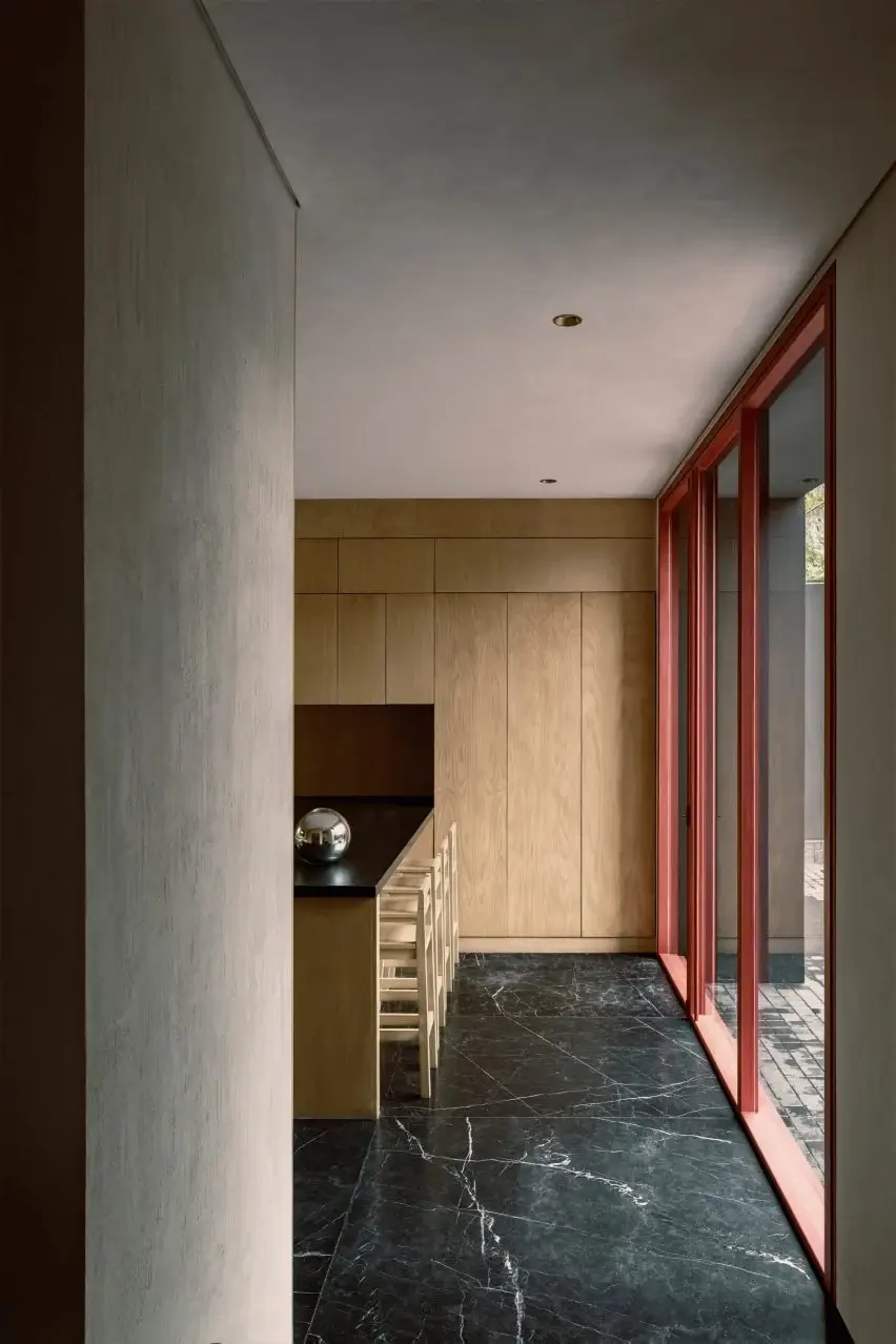 The black cladding is “a very simple flattening done by local masons with a sponge,” done to achieve a natural and irregular texture that would absorb and show the climatic conditions of the region over time. Moreover, asymmetrical windows dot the facade and organized in harmony with the natural topography. They have maroon-colored frames like the doorframes, so they would stand out against the black walls.