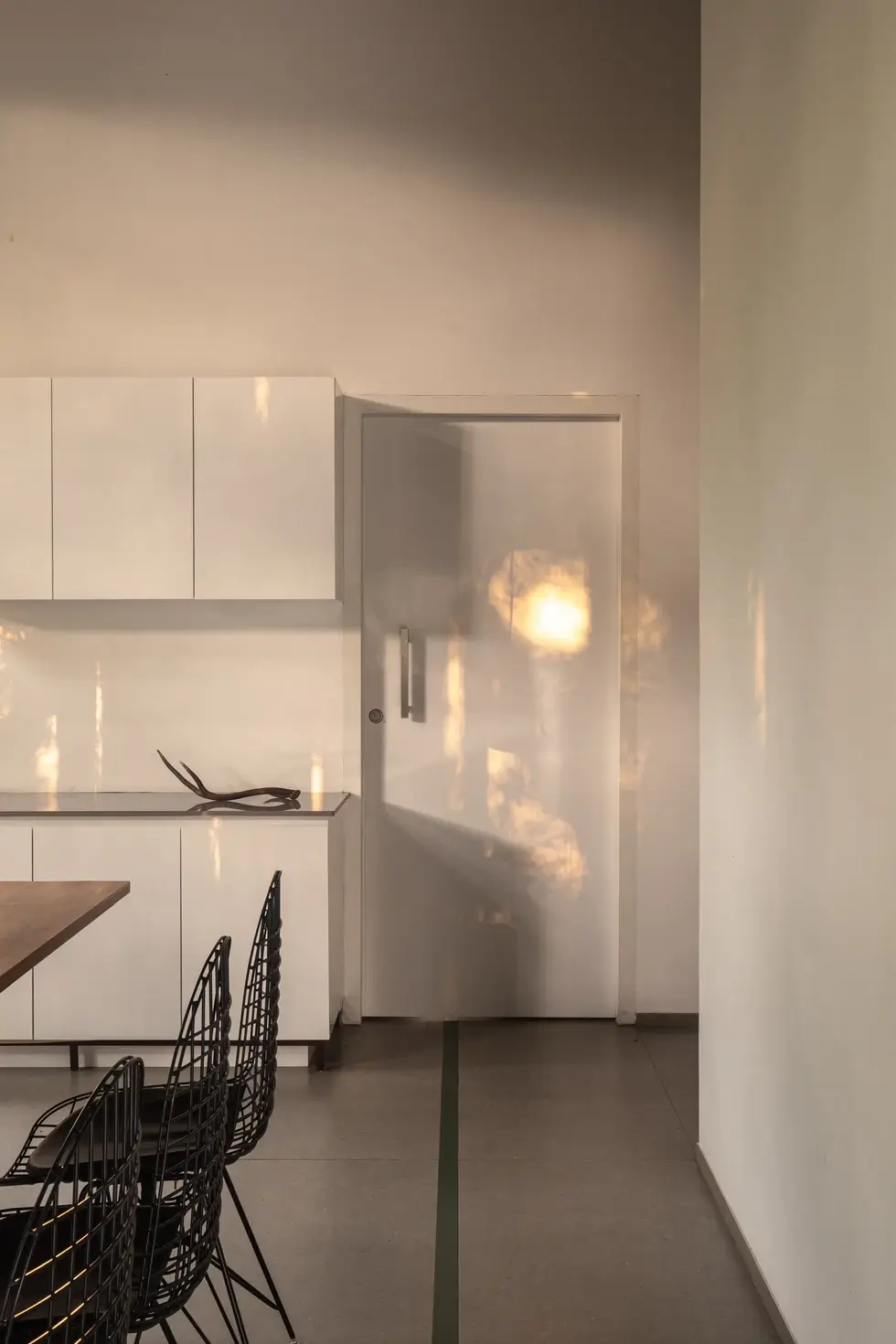 The industrial theme extends to volumes within as floors and ceilings appear unfinished. White walls offer a visual contrast from the mostly gray tones of the House XO interior. Overall the inside seems expansive glazing allows natural lighting to filter through by day.