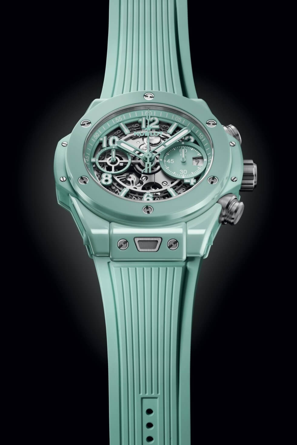 Hublot fills the spines of the hands and indices with white lume to aid with low-light readability. Despite the varying sizes, the latest additions to the Big Bang Unico catalog all run on an in-house MHUB1280 automatic caliber. The movement features 43 jewels and a 72-hour power reserve. Each reference includes a rubber strap that matches its hue.