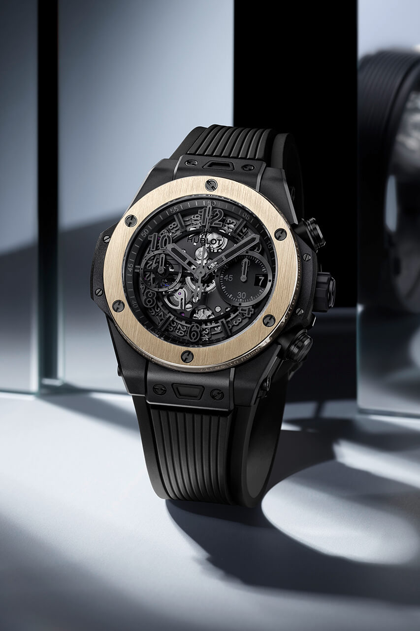 It then pairs this to a ridged black silicone rubber strap with its signature deployant buckle clasp. The blackout skeleton dial only features the Hublot branding along with two sub-dials at 3 o’clock and 9 o’clock. The blackout theme then continues to the exhibition caseback.