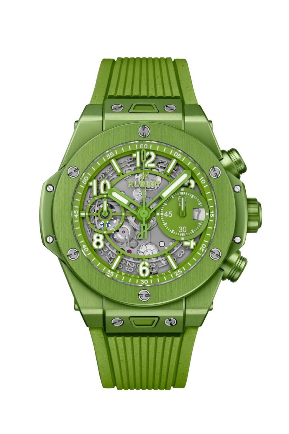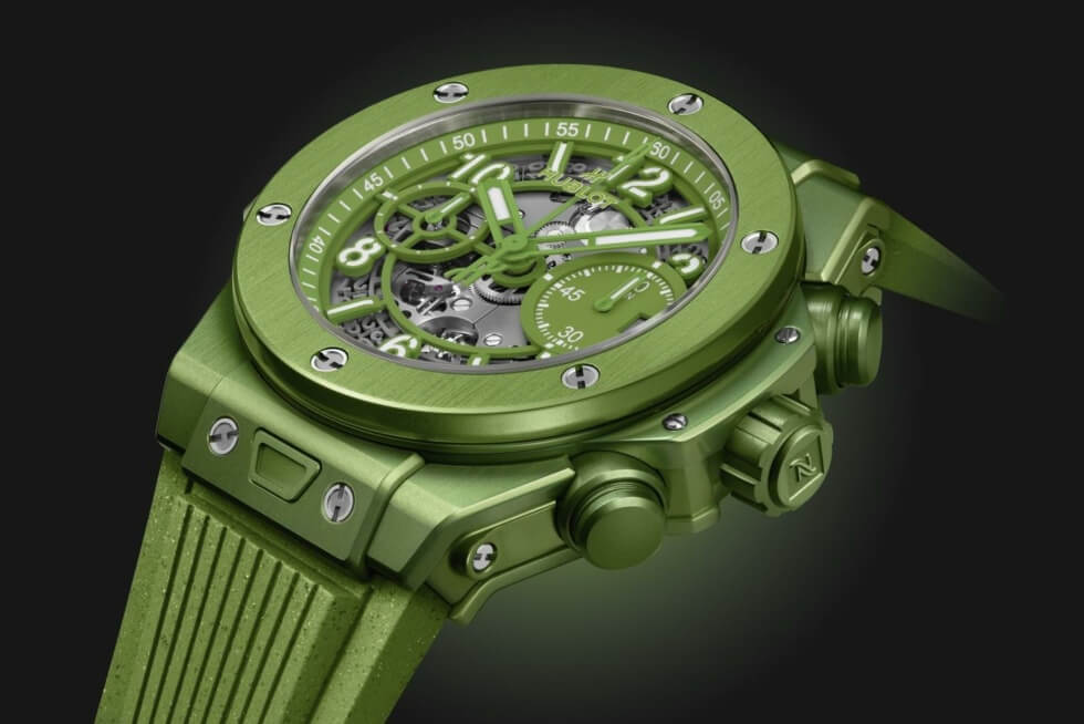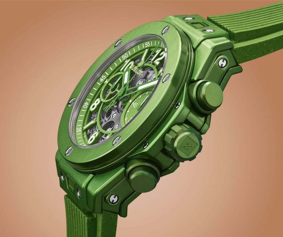 The fact that they’re sourcing components from unconventional items is already generating a lot of publicity for this exclusive production run. The Big Bang Unico Nespresso Origin is presented with a 42 mm case and fixed bezel crafted out of recycled aluminum from the aforementioned single-use containers. These are then anodized in green which probably denotes its eco-friendly origins.