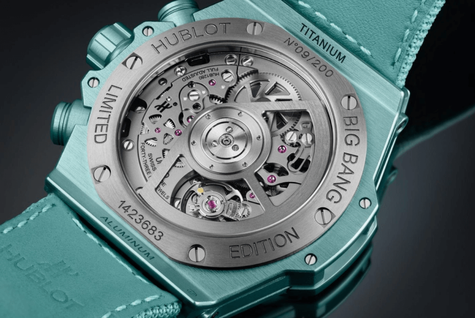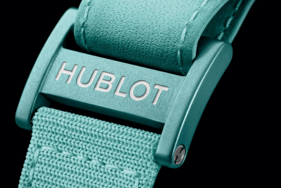 This time, you won’t find any ceramic elements on this chronograph. Instead, the 42-mm case and fixed bezel are crafted out of aluminum which is then anodized in turquoise. To add some contrast, Hublot mixes a satin and polished finish for the surfaces.