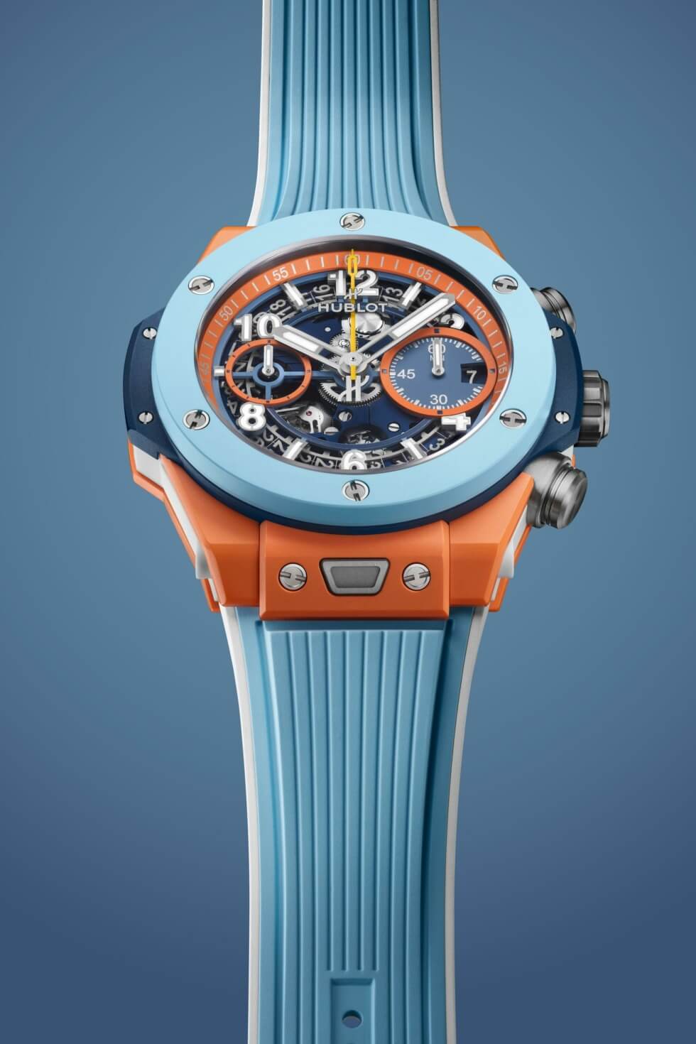 Furthermore, white Super-LumiNova inserts offer legibility in the dark. In charge of timekeeping is Hublot’s HUB1280 UNICO Manufacture self-winding caliber with a 72-hour power reserve. The Big Bang Unico Summer 2025 includes three rubber straps in sky blue, dark blue, and orange. All come with a white lining and titanium deployant buckle clasps.