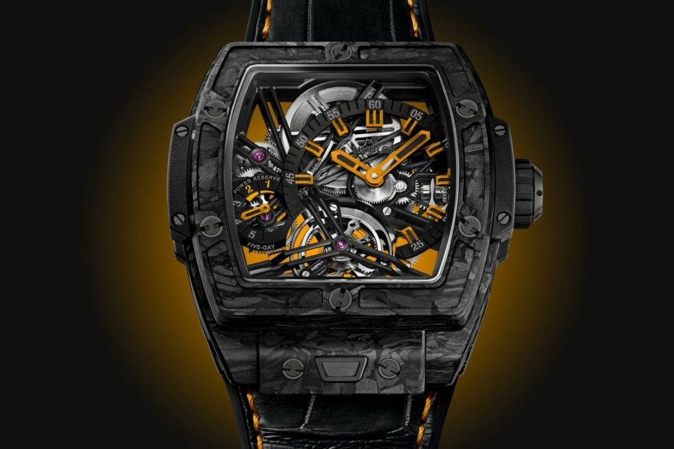 The transparent windows provide a full view of the skeleton dial and the components of its self-winding HUB6020 Power Reserve Skeleton Tourbillon Movement. The Hublot Spirit of Big Bang Tourbillion 5-Day Power Reserve Veuve Clicquot includes a black alligator leather strap with the champagne house’s signature orange stitching and an orange alligator leather strap with the stitching in black.