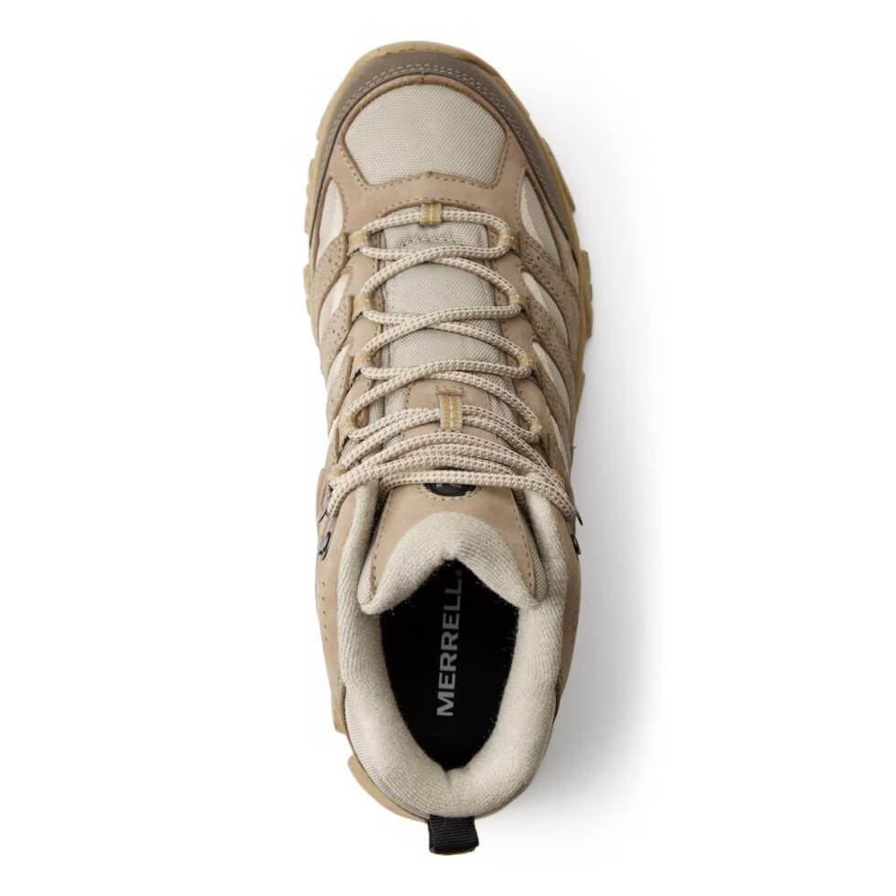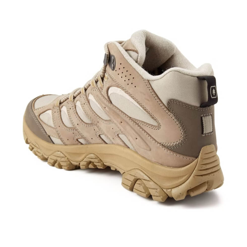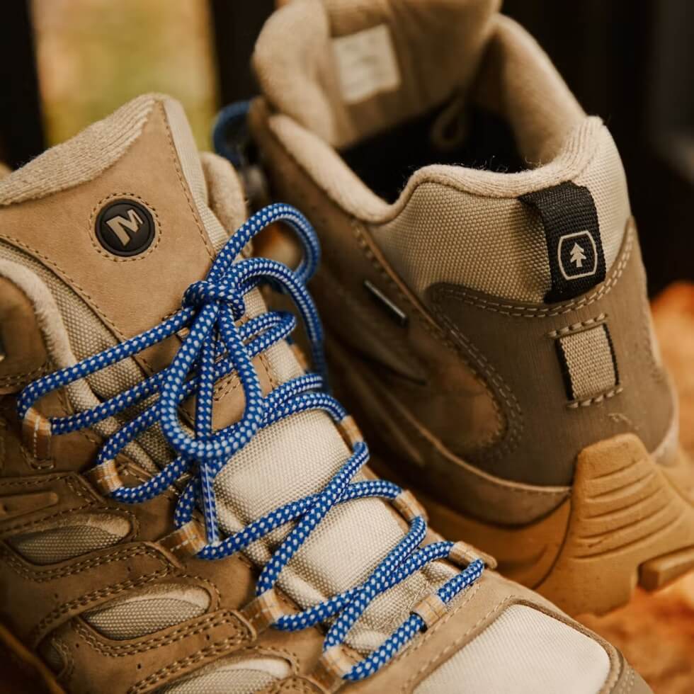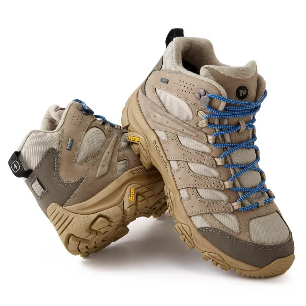 The tonal colorway features several midfoot overlays with synthetic fabric lace loops. The only contrast to the earthy tones of the Huckberry x Merrell MOAB 3 Smooth is the extra pair of blue shoelaces. To keep dirt and other particles out is a gusseted tongue, while a toe cap adds more protection.