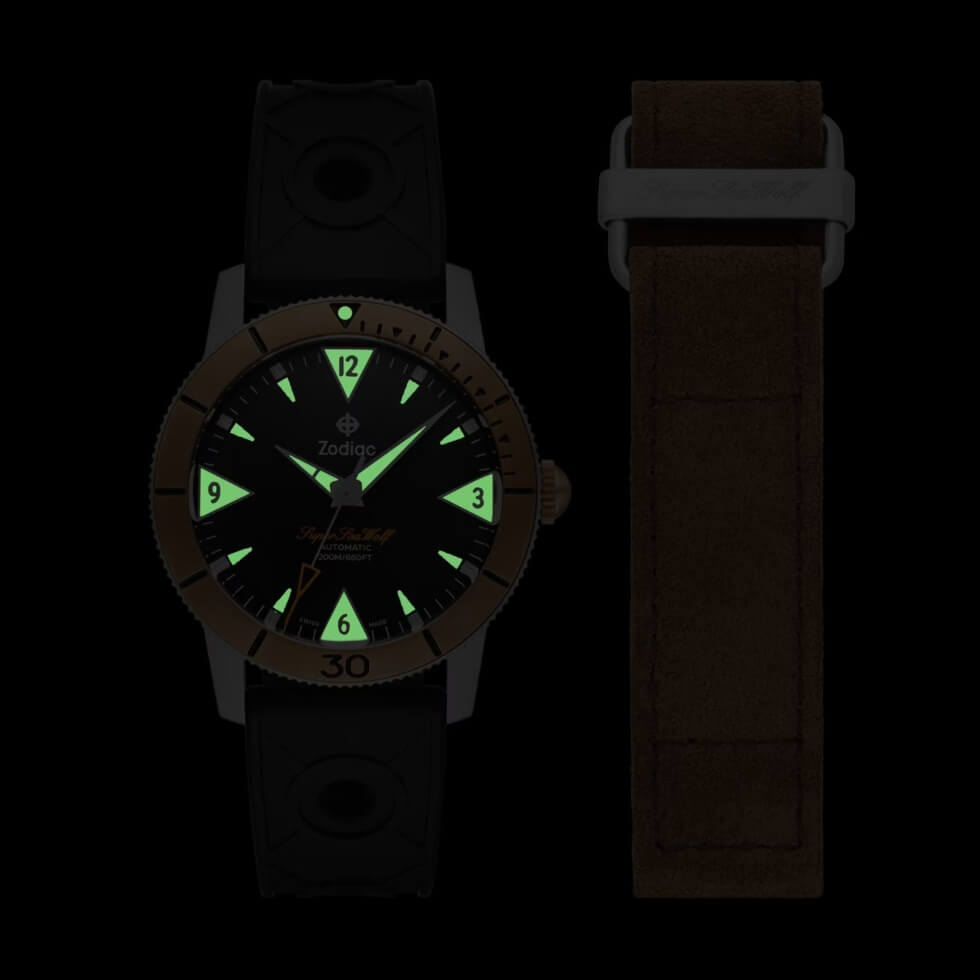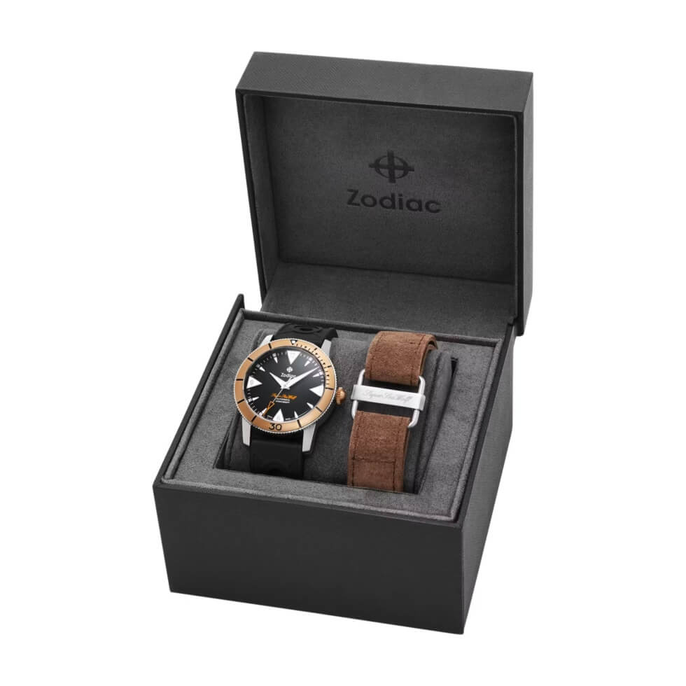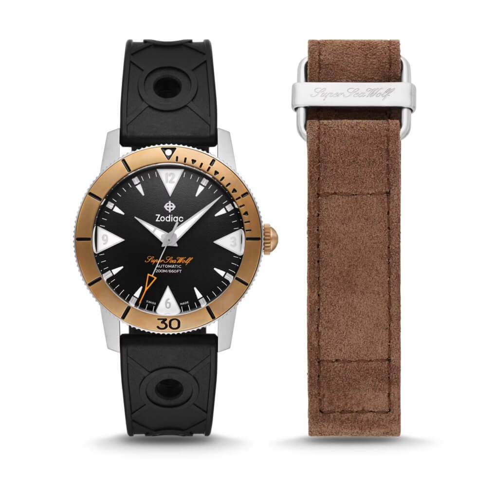 Next is the matte black dial contrasted by the hour markers, minute track, and hands coated with Super-LumiNova. The Super Sea Wolf script is printed in orange, while the Zodiac signature is in white. At the heart of this timekeeping instrument is a 26-jewel Swiss-made STP 1-11 self-winding caliber with a 44-hour power reserve. Each package includes a black caoutchouc rubber strap and a brown suede utility strap.