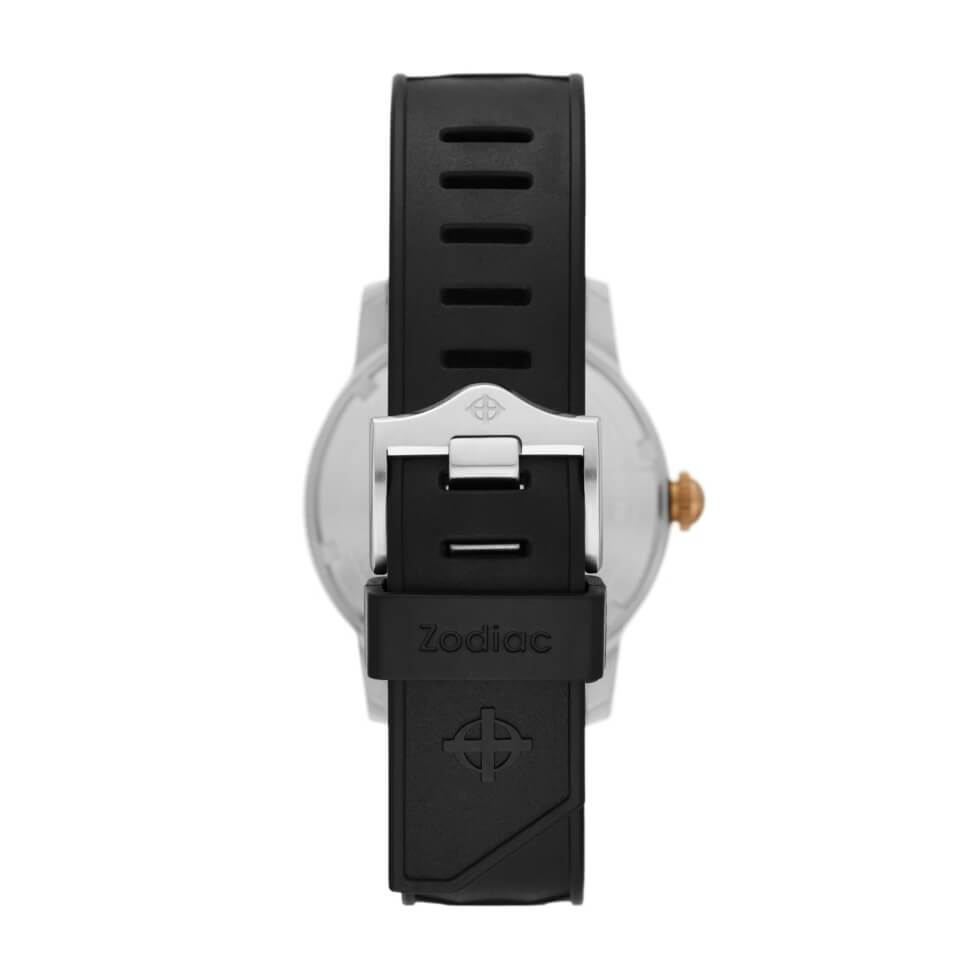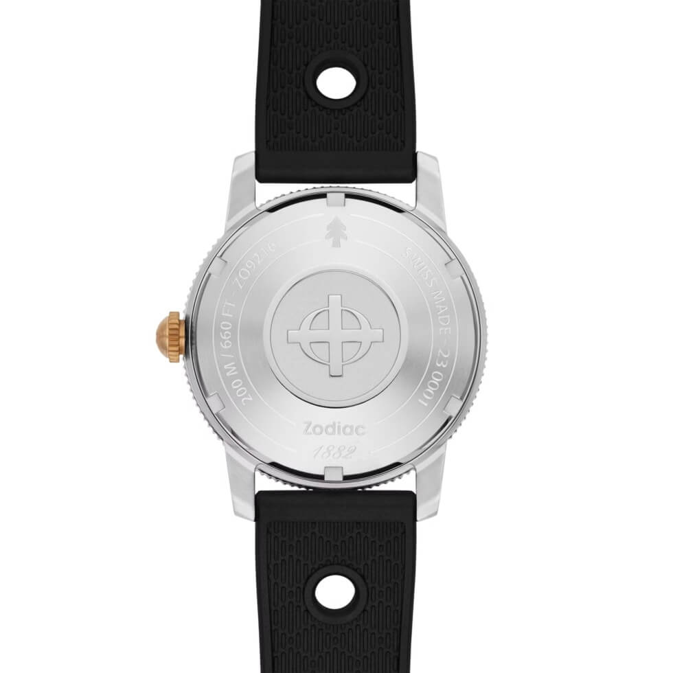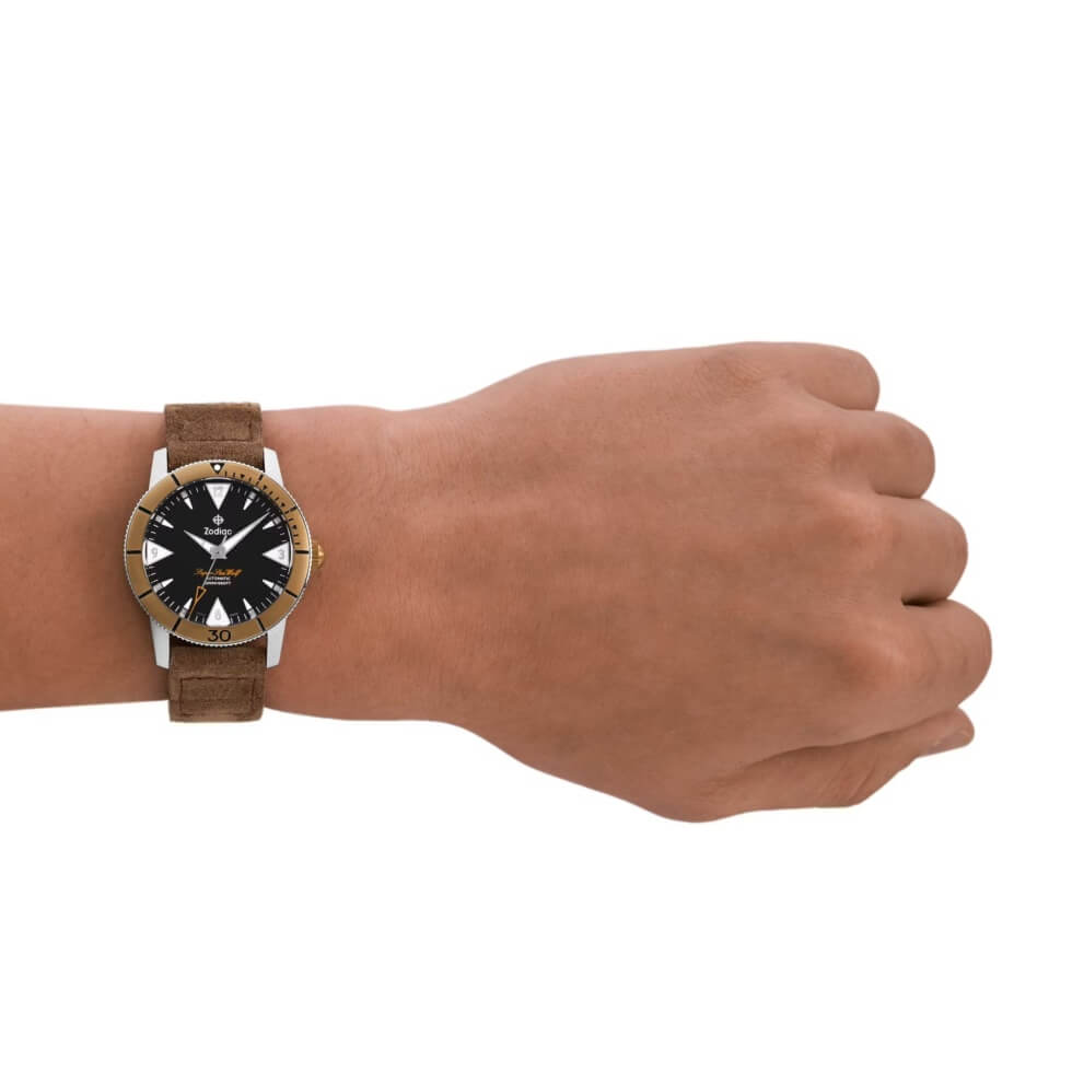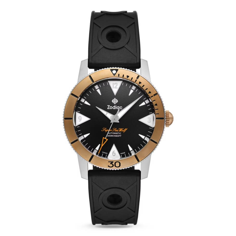 Next is the matte black dial contrasted by the hour markers, minute track, and hands coated with Super-LumiNova. The Super Sea Wolf script is printed in orange, while the Zodiac signature is in white. At the heart of this timekeeping instrument is a 26-jewel Swiss-made STP 1-11 self-winding caliber with a 44-hour power reserve. Each package includes a black caoutchouc rubber strap and a brown suede utility strap.