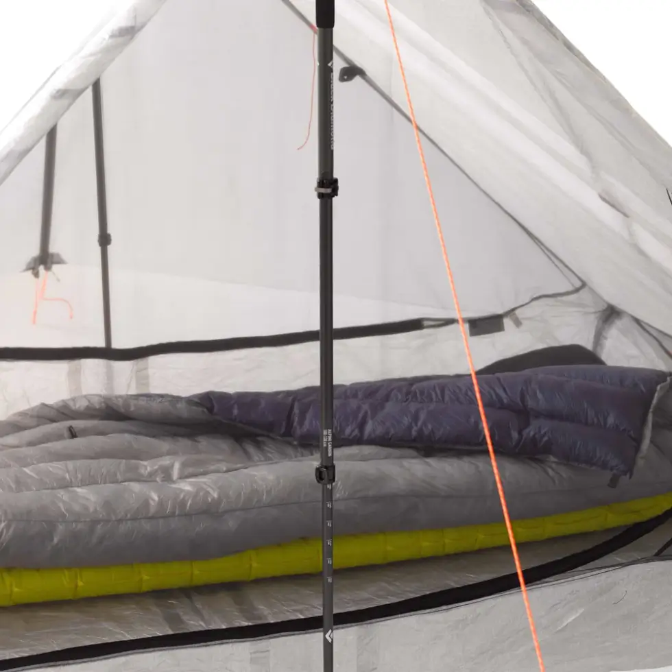 Hyperlite’s Unbound 2P Tent sets up with two 48″ trekking poles to save on packable weight at 680g. The tent measures 8.5″ x 6.0″ x 5.5″ when packed and can sleep two adults at its bathtub floor measurement of 90.0″ x 48.0″ x 8.0 and height of 48″.