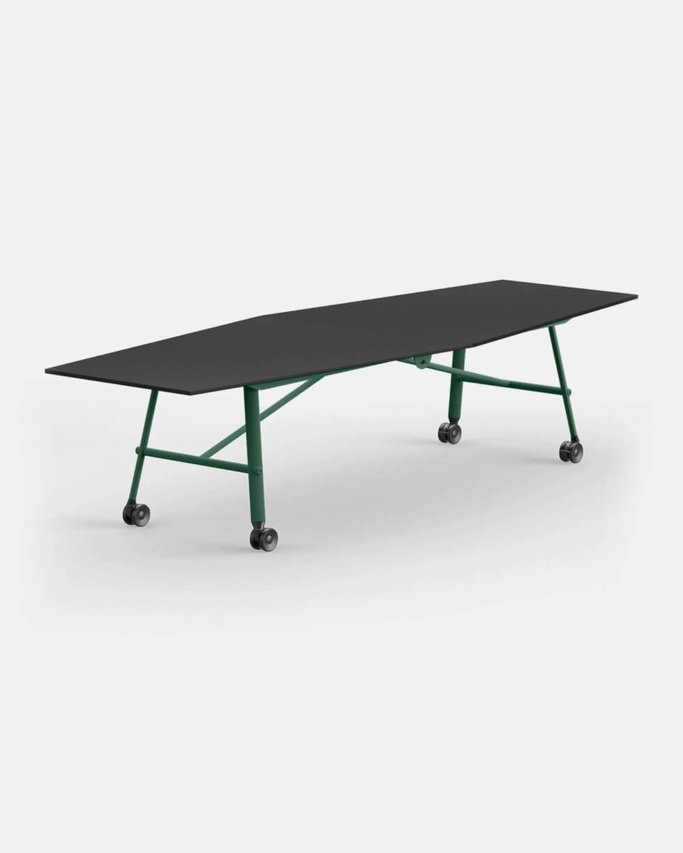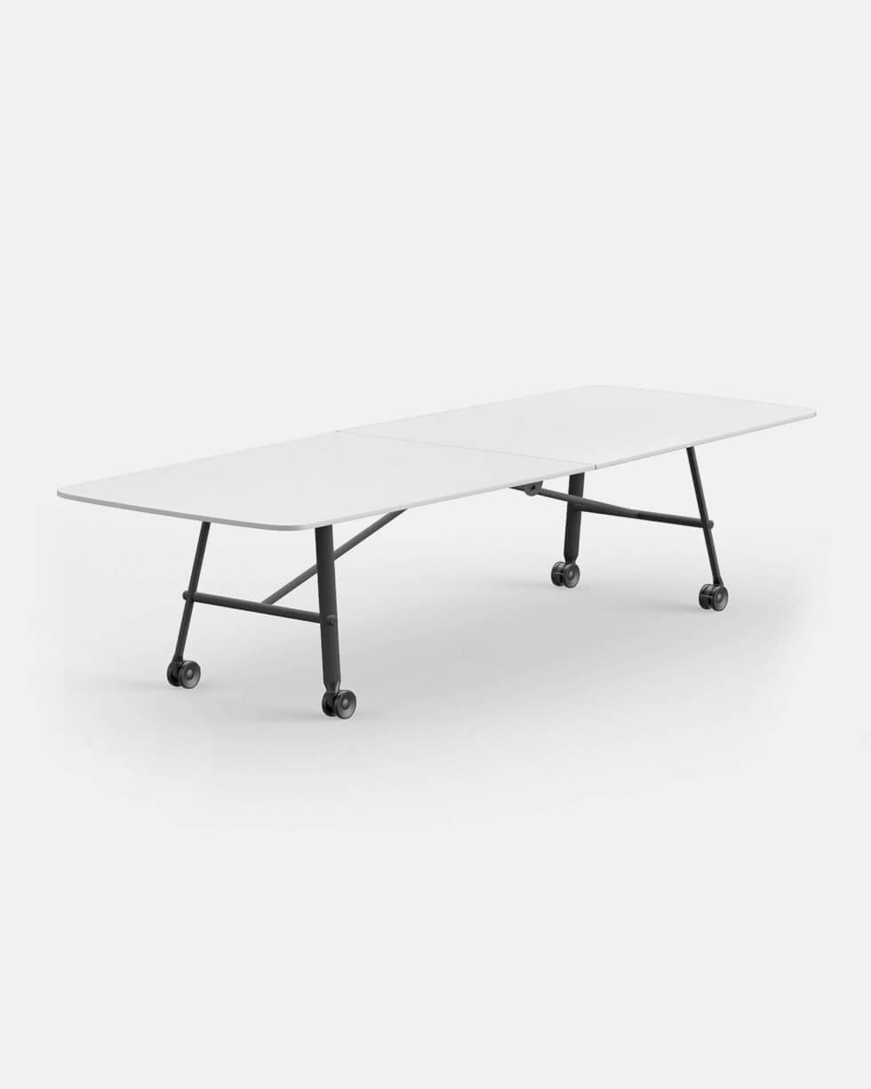 The Tam Tam Collection features a centrally-placed hinge to allow both sides of the table top to fold in an upright position. Meanwhile, the combination of steel tubes and castor wheels integrated with breaks ensure a sturdy structure either when the table is folded for storage or unfolded during use.