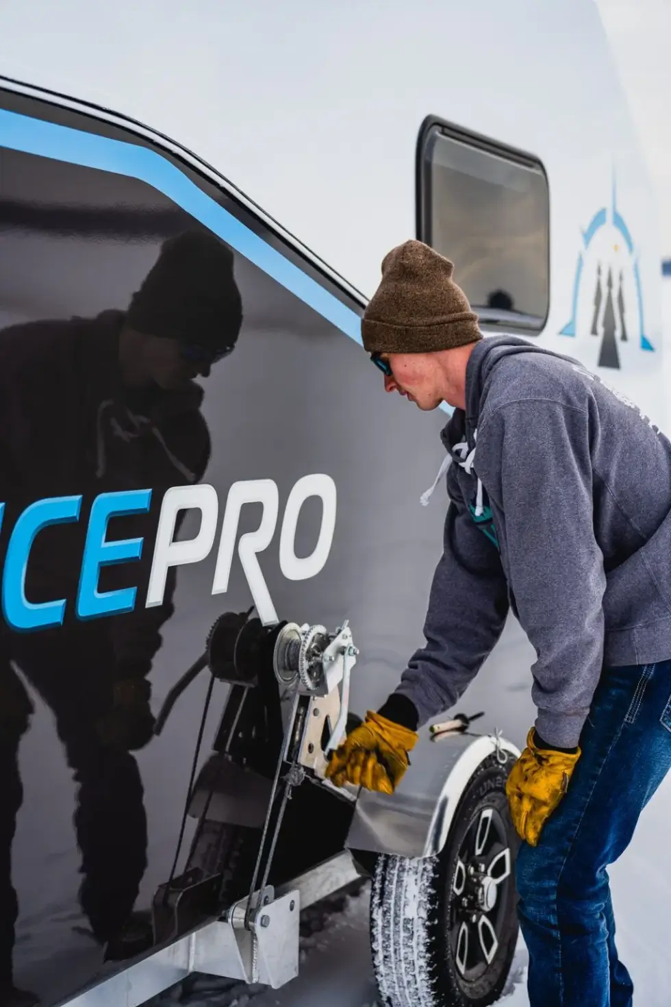 Evelend constructs the IcePro with an aluminum frame, a fiberglass shell, and other composite materials. The wheels are locked in place when on the road but a winch system allows you to lower the caravan directly on top of the ice. There are multiple removable catch covers for drilling.